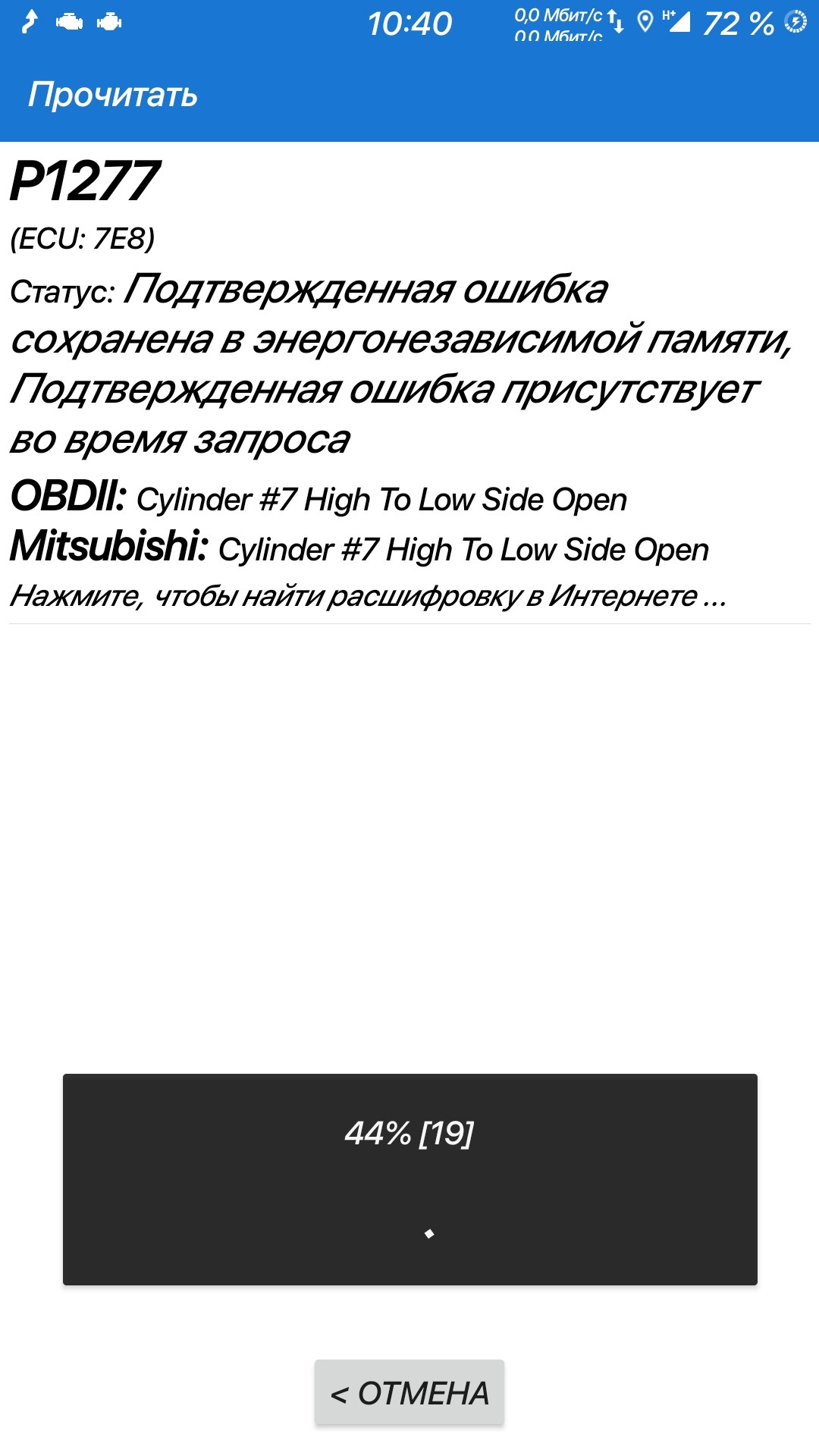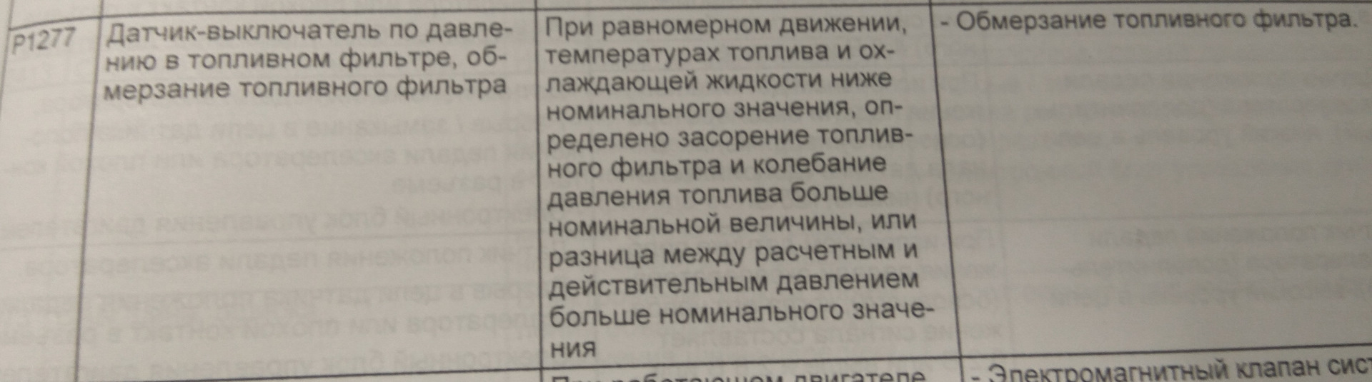 Поиск в интернете по номеру ошибки P1277 выдал кучу результатов. В приоритете просмотра был "www.drive2.ru" и "www.pajero4x4.ru" Ответ нашёлся на Драйве, огромное спасибо MihaNN52 за развернутый пост в трёх частях, ЦИТИРОВАТЬ не буду рекомендую к чтению на досуге ССЫЛКА. Температура на улице по бортовику -7 и поскольку я проехал до появления ошибки около 50 км. возникли сомнения, что фильтр или топливопровод замерз, да и на ощупь фильтр не сильно холодный. Пробег на данном фильтре был около 9 т.км, масло меняю на 7 т.км, фильтра не было в наличии и замену отложил но потом. В раздумьях о забитом фильтре и возможных последствиях я проехал ещё 70 км до авторынка и раз 10 останавливаясь стереть ошибку, хотя достаточно заглушить машину на пару минут, что я и делал. Замена фильтра решила проблему. Запись в бортжурнал откладывал до распила.
