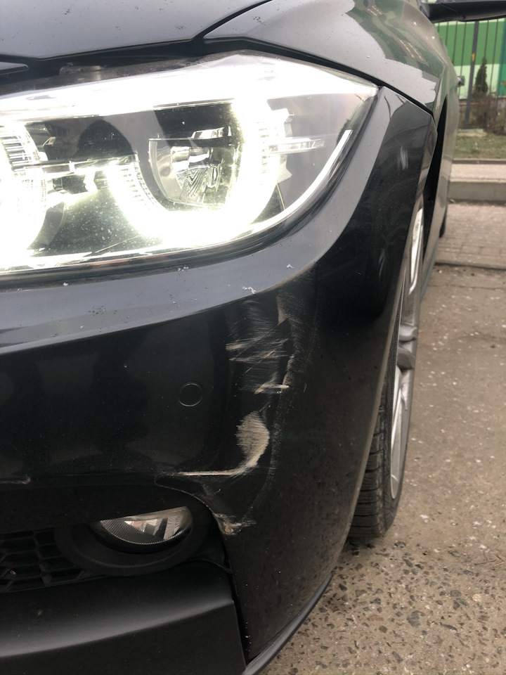По иронии несколько месяцев назад была снята пленка с переднего бампера, сегодня утром подхожу к машине и сердцем чувствую что-то не так…обхожу к переду и вижу это.
