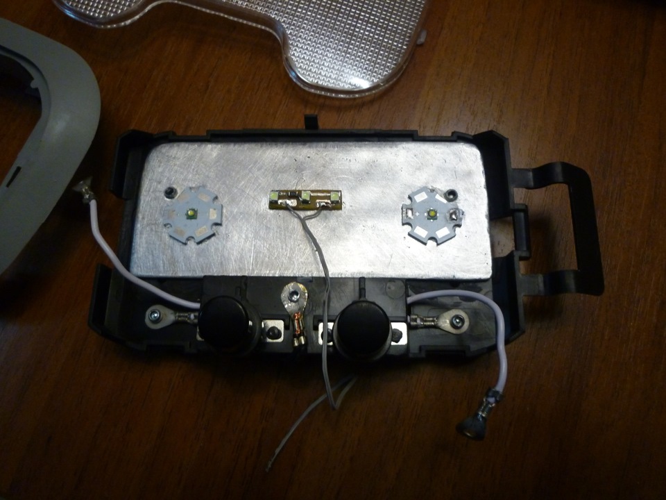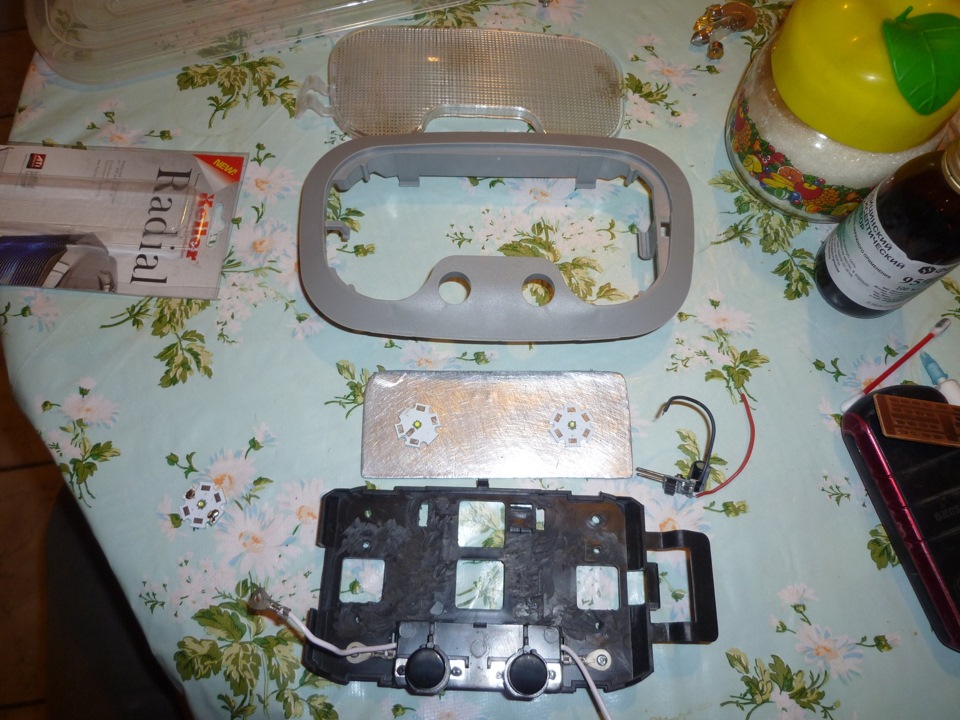 Я купил пластинку на 50 диодов, 100р, выкинул всю начинку плафона, прям на стекло на тонкие полоски двухстороннего скотча приклеил, и все! Собрал, включил — в машине день