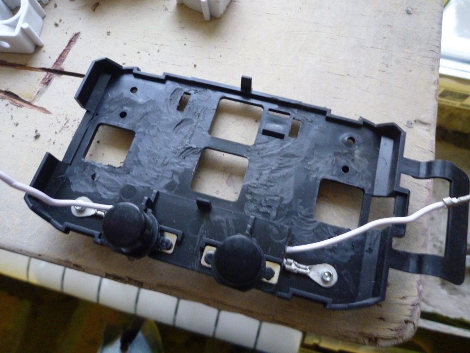 Минусовая клемма теперь в аккурат между выключателей. Её и радиатор со светодиодами приклепал к основе 3-х мм клёпками: