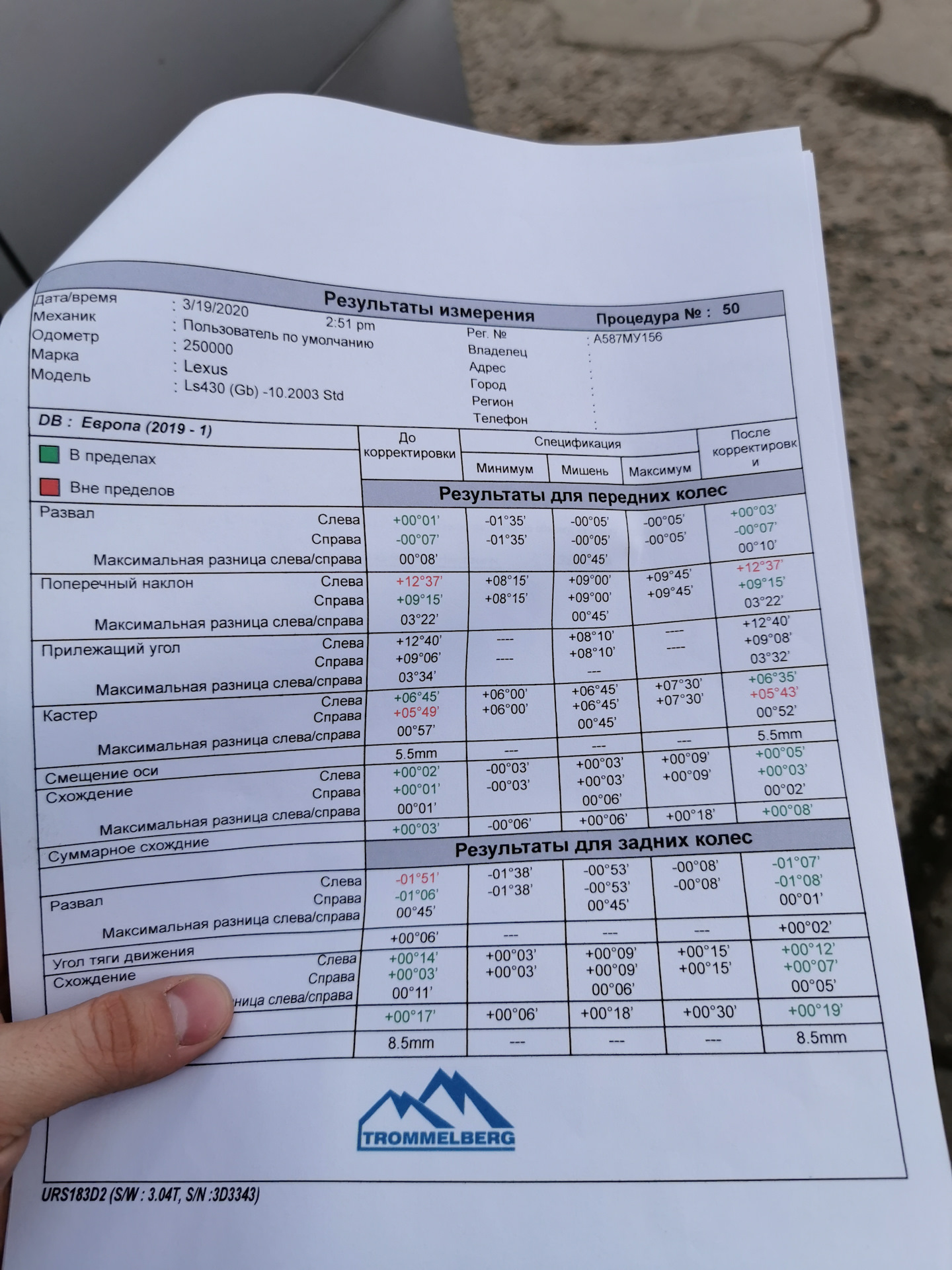 Ну и проверил сход-развал, кроме заднего левого колеса (чутка развал)- было норм.