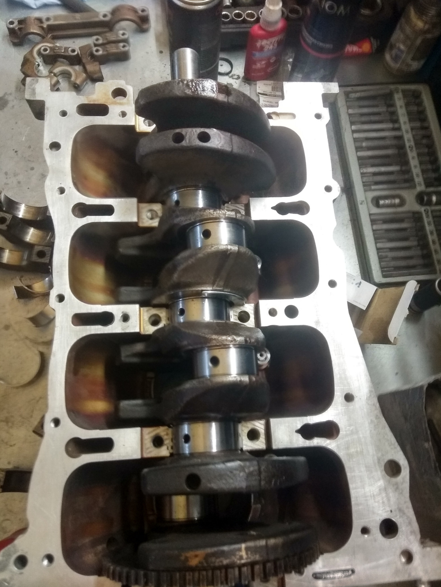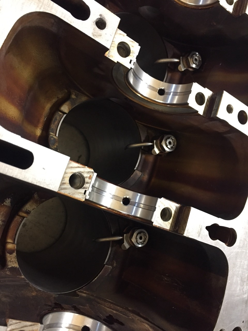 Когда блок приехал назад в гараж, в него были установлены форсунки охлаждения днища поршня (вроде на 2,4 мотор их ставили). Установлены поршня, вкладыши, колено, все на месте.