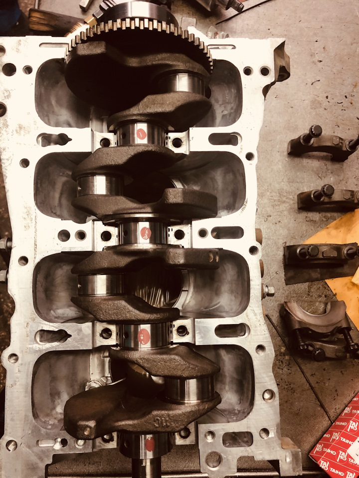 Блок с коленом отдали расточнику, шейки колена шлифанули, блок загильзовали чугунными гильзами под стандартные оригинальные поршня. Промеряны шатуны, 2 и 3 набили элипс, были приобретены 2 шатуна (они оказались на 22 но легче родных, поэтому были куплены ещё 2 таких же шатуна) Подобрали вкладыши.