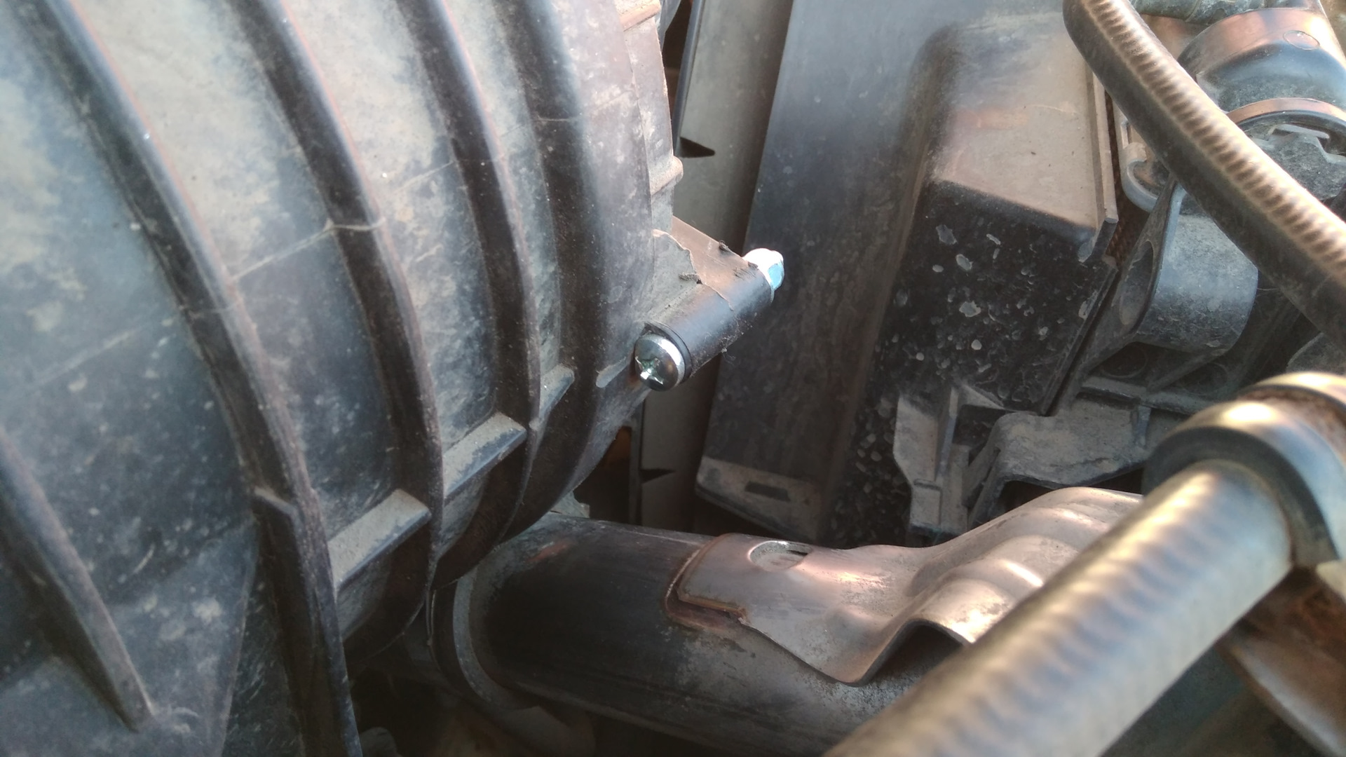 Далее надо просверлить отверстия в корпусе воздушного фильтра, вставив втулки в штатные места и используя их в качестве направляющих. На машине это сделать достаточно сложно. Надо снимать корпус фильтра. Два болта его крепления легко откручиваются торцевой головкой на 13, а вот третье спрятано под расширительным бачком и его кронштейном.