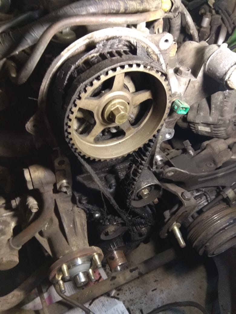 Нашел неисправность отсутствия искры, а она на лицо, точнее была под крышкой, просто ремень грм "устал" и очень, отделались легким испугом, благо клапана на этом двс не гнет. Заказываем комплект реней, роликов и я думаю до кучи сальники колена и распредвала, осталось за малым, открутить болт шкива колена и его снять (шкив). Напомню, что пробег состовляет 160 т.км. и я так думаю, что ремень не менялся, и я у этой девушки первый)). Вот как то так.