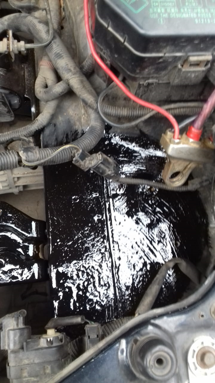 При замене подушек двигателя, под аккумулятором увидел ржавчину, всё зачистил и замазал.