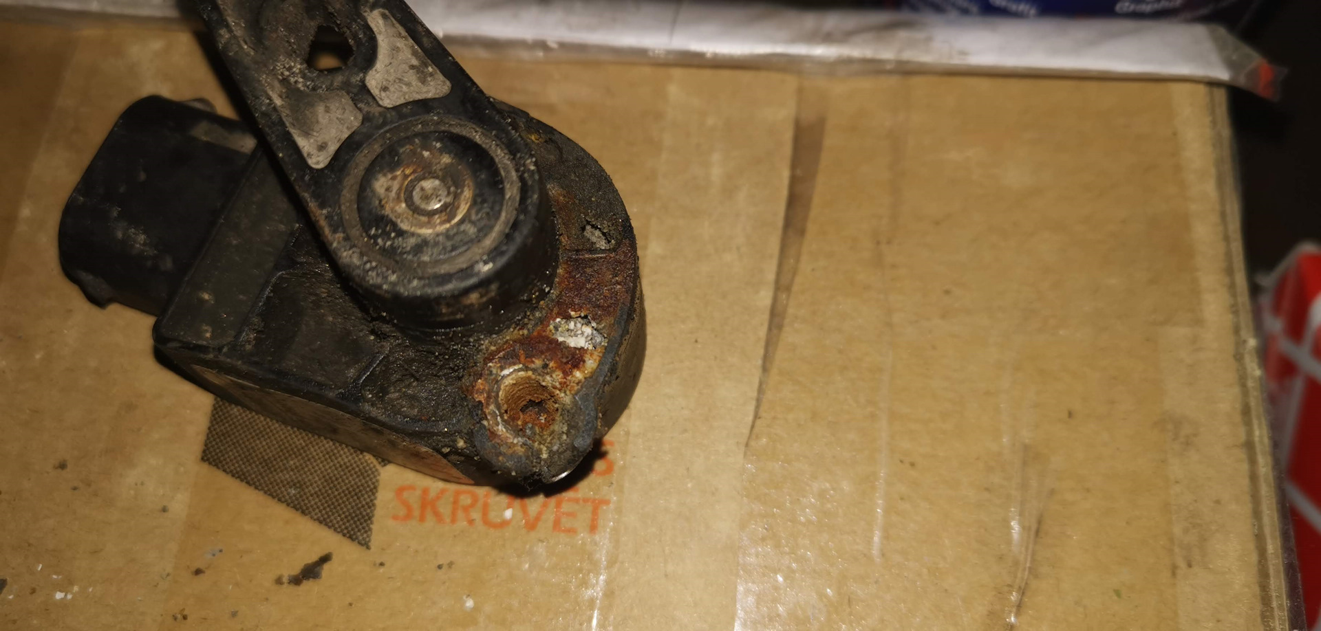 Замена заняла минут 40 от силы (две гайки открутить и штекер отсоединить), и то из-за того что предыдущий датчик был так намертво прикручен к крепёжной пластине что вся резьба на болтах была покорёжена. И тут, собственно, не удивительно что старый датчик сдох, если с такой дури закручивать болты в пластмассовый корпус что его разрывает на части: