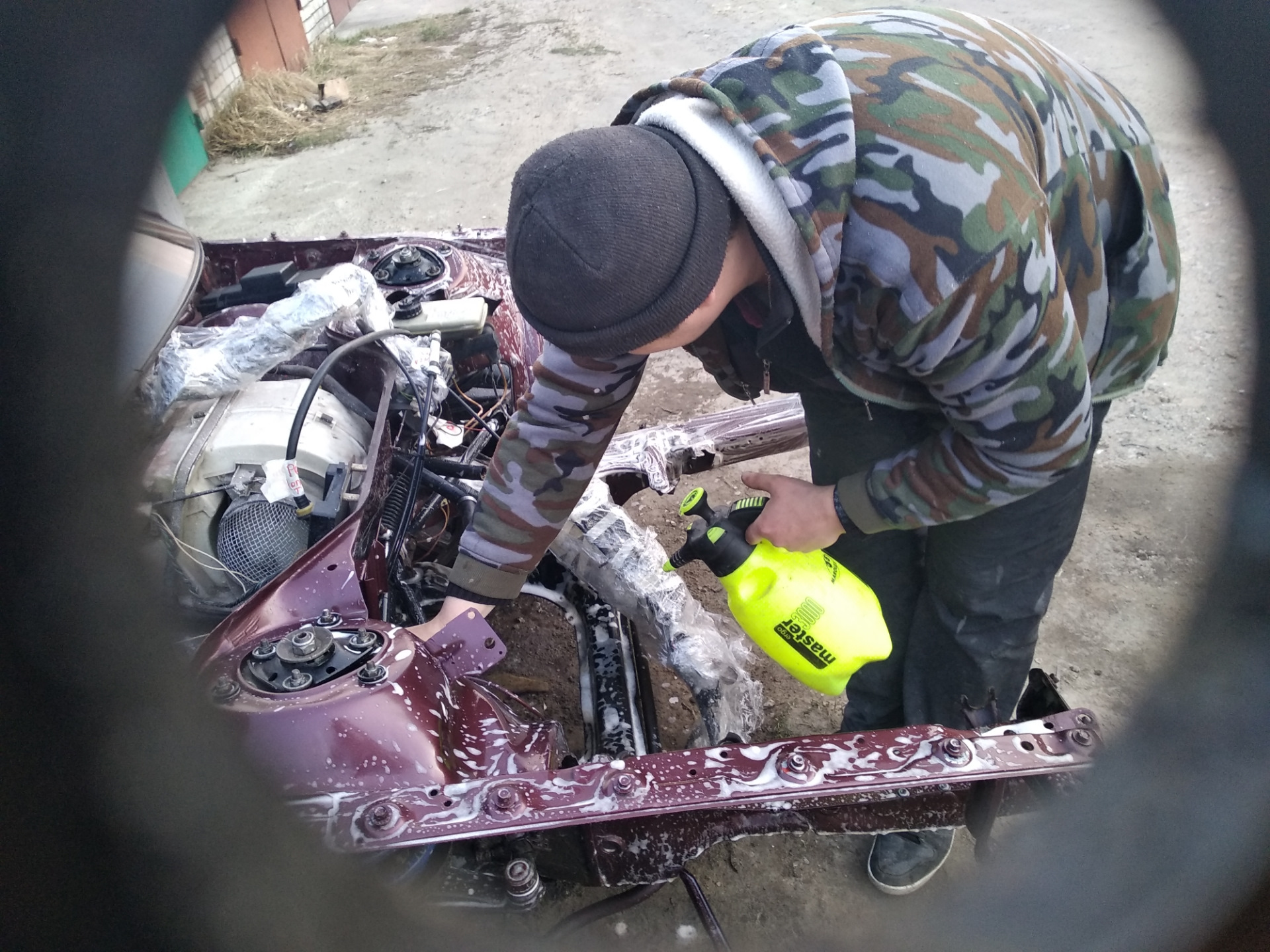 Так же выкатив на улицу я снял передние крылья и приступил к мойке подкапотки от песка и грязи, сначала отвёрткой, затем водой, клен мотор, кисточкой вручную прощелся всё поверхность тщательно и смыл вадою обильно.