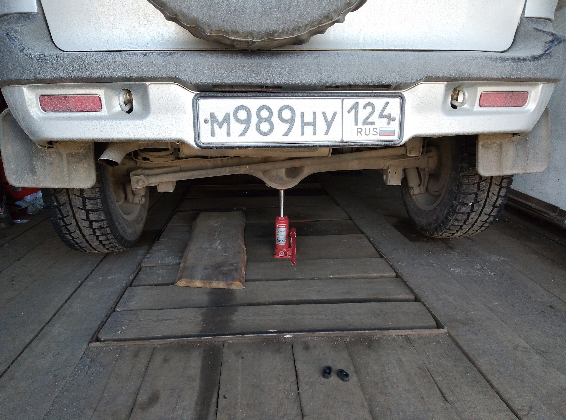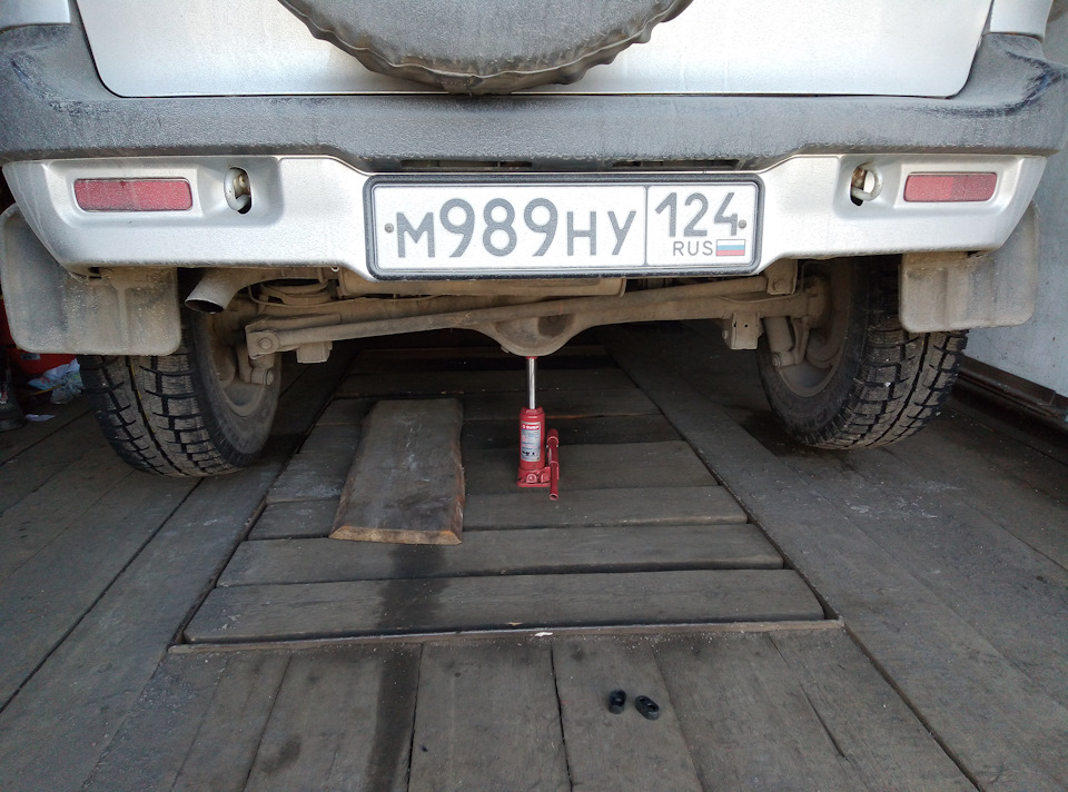 А када я переобуваюсь, задний мост домкрачу поочереди, то с одной, то с другой стороны под крепление реактивных тяг. А тут смотрю фотку — домкрат под яблоком моста… А что, так можно было?!