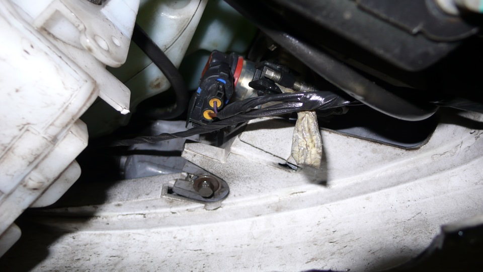 После осмотра выяснили, что снимать фары не вариант, да и лень, если честно говоря, было это делать. Решили попробовать так подлезть и вытащить патрон из фары. Это удалось сделать достаточно нормально с левой по ходу движения фарой и вот он родимый, нужный нам патрон ))