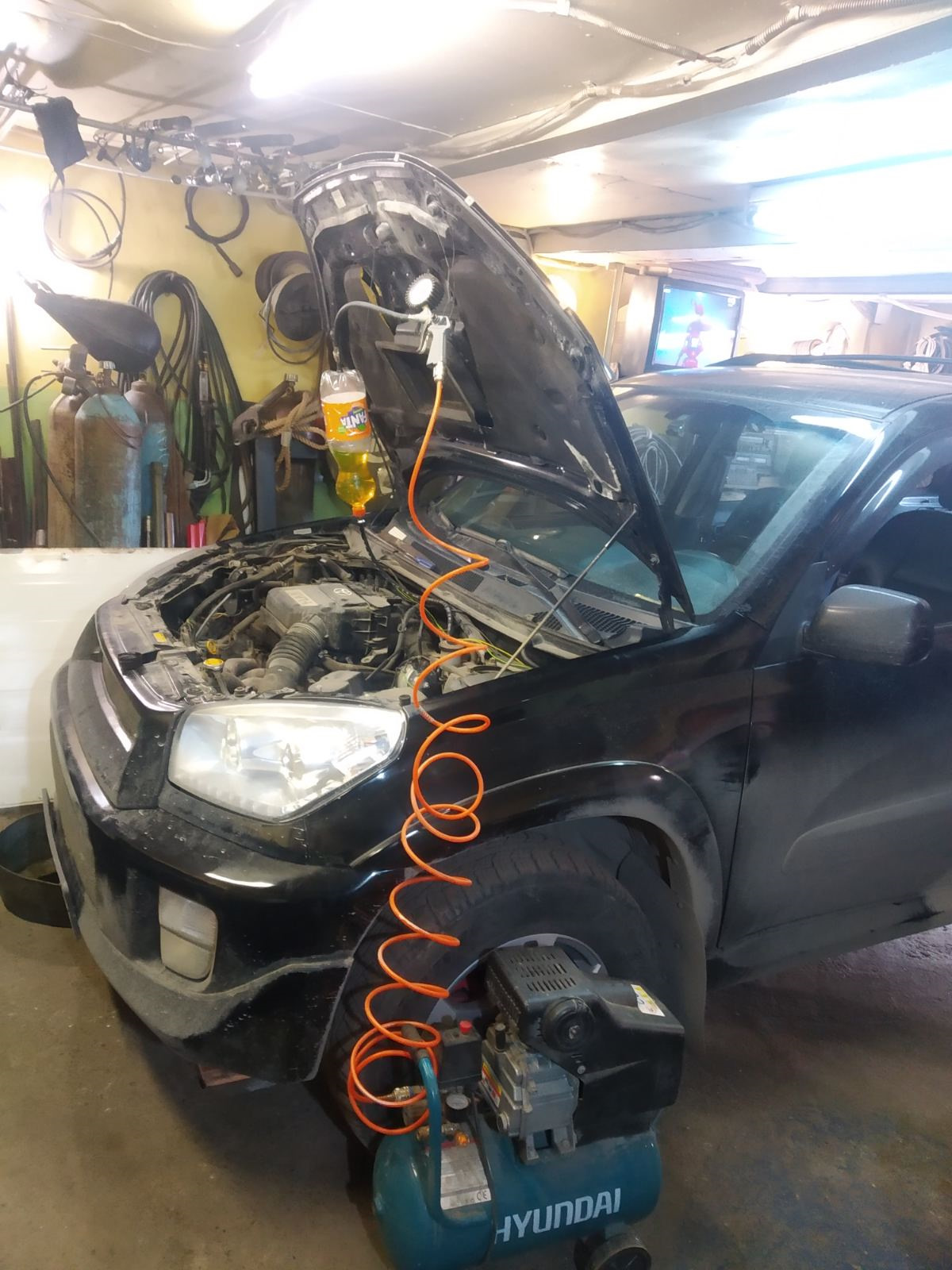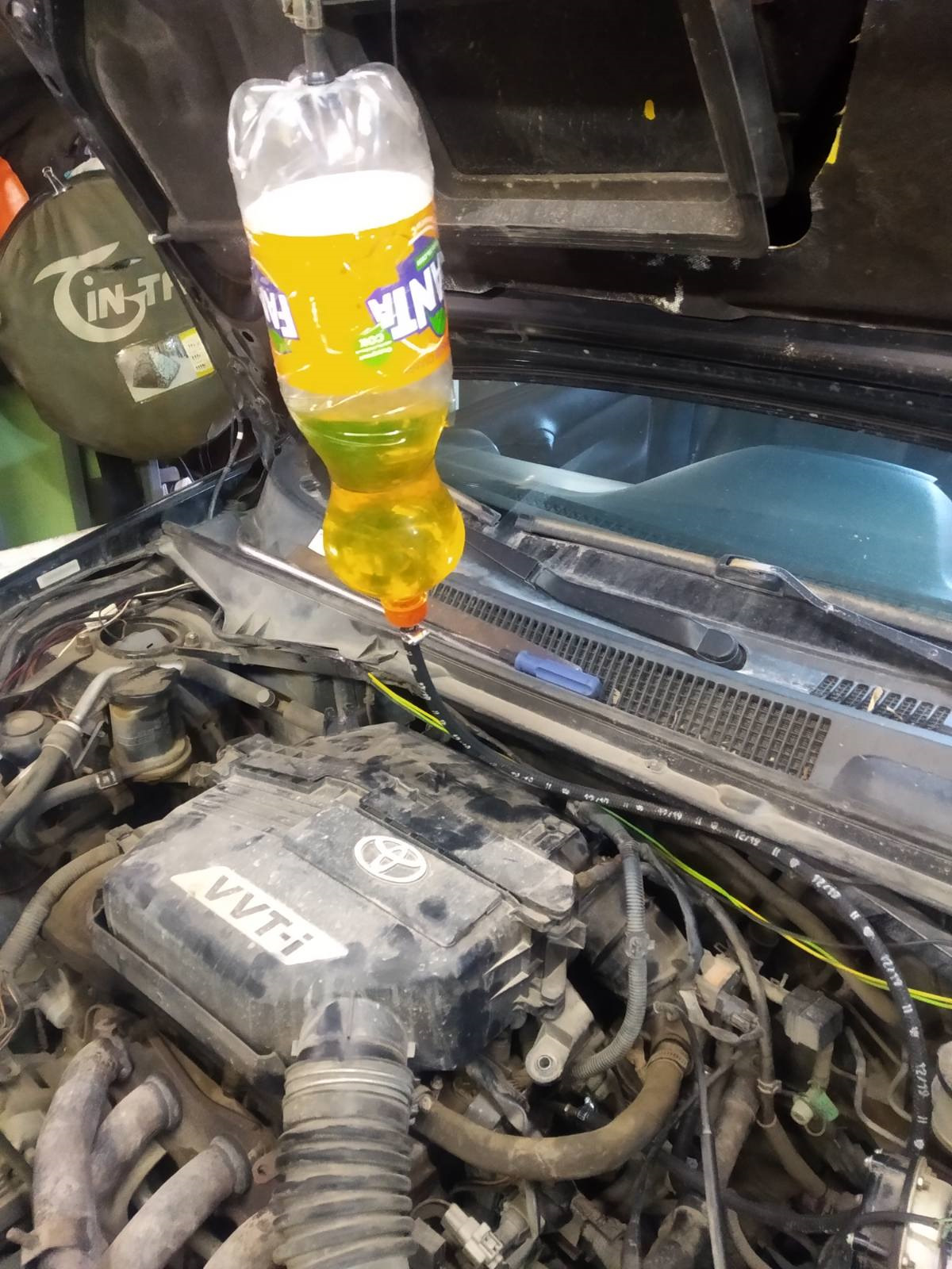 Приветствую всех наших гостей на страничке нашего бортовика. Сегодня в гаражно-тепличных условиях произведена промывка форсунок без их снятия при помощи нехитрого приспособления. А так же замена ремкомплекта РТИ и сеточек форсунок. Подобные записи на сайте присутствуют. Но так как я это проделывал впервые, остановлюсь и расскажу, как это сделал я. Отключаем бензонасос и стравливаем давление в топливной магистрали, отсоединяем муфту топливопровода от патрубка демпфера пульсации топлива. Муфту отсоединять нужно осторожно, т.к. есть вероятность отломить алюминиевый патрубок от демпфера. Фиксатор в муфте держит очень крепко, требуется большое усилие, чтобы разъединить соединение. Подбираем прочную 2-литровую ёмкость от Fanta. В крышку врезаем штуцер Д6. В дно бутыли врезаем пипку от колеса. К штуцеру подсоединяем шланг 0,5м Д6, второй конец шланга подсоединяем к топливному трубопроводу демпфера. Концы шланга надёжно фиксируем хомутами. Схема собрана. Теперь, перед заправкой реагента, обязательно проверяем нашу схему на прочность и герметичность. Компрессором даём давление 3 Атм и проверяем выдержкой 1 мин. Испытание моя схема выдержала с первого раза. Стравливаем давление и заливаем реагент LAVR ML101, даём давление 3 Атм и заводим двигатель. Далее всё по инструкции, которая изложена на флаконе реагента.