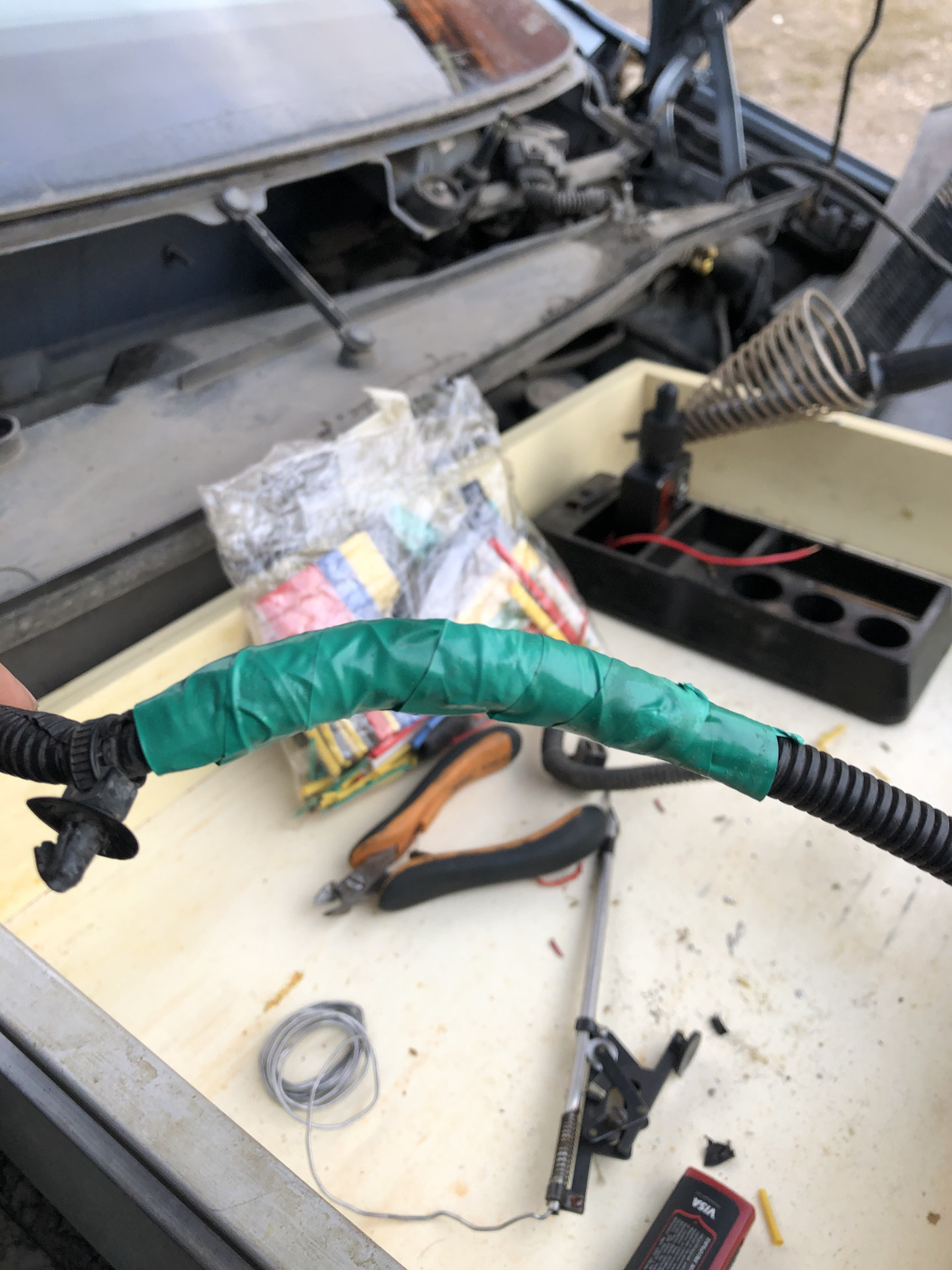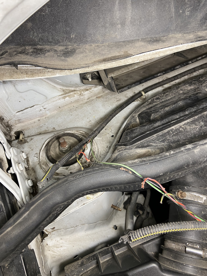 10. Добравшись до проводки, снял ее с клипс и полностью вытащил через крыло в моторный отсек.