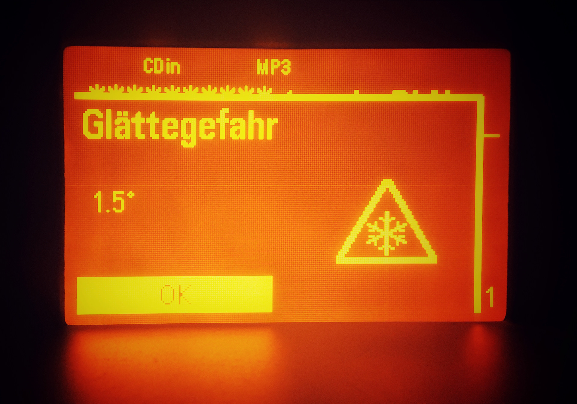 Если все прошло удачно, то предупреждение о возможной скользкой дороге на экране БК вы не увидите / предупреждение о гололеде будет выводиться на экран БК, если температура на улице будет находиться в диапазоне от -3 до +3 градусов.