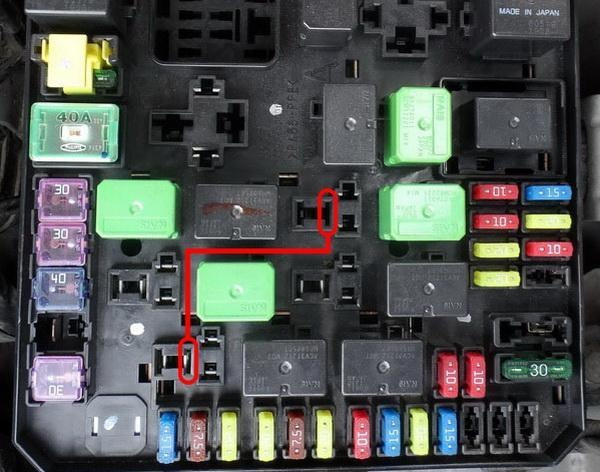 Затем согластно инструкции необходимо было приобрести дополнительное реле MR588567 и установить его в разьем вместе с перемычкой к центральному контакту реле ПТФ