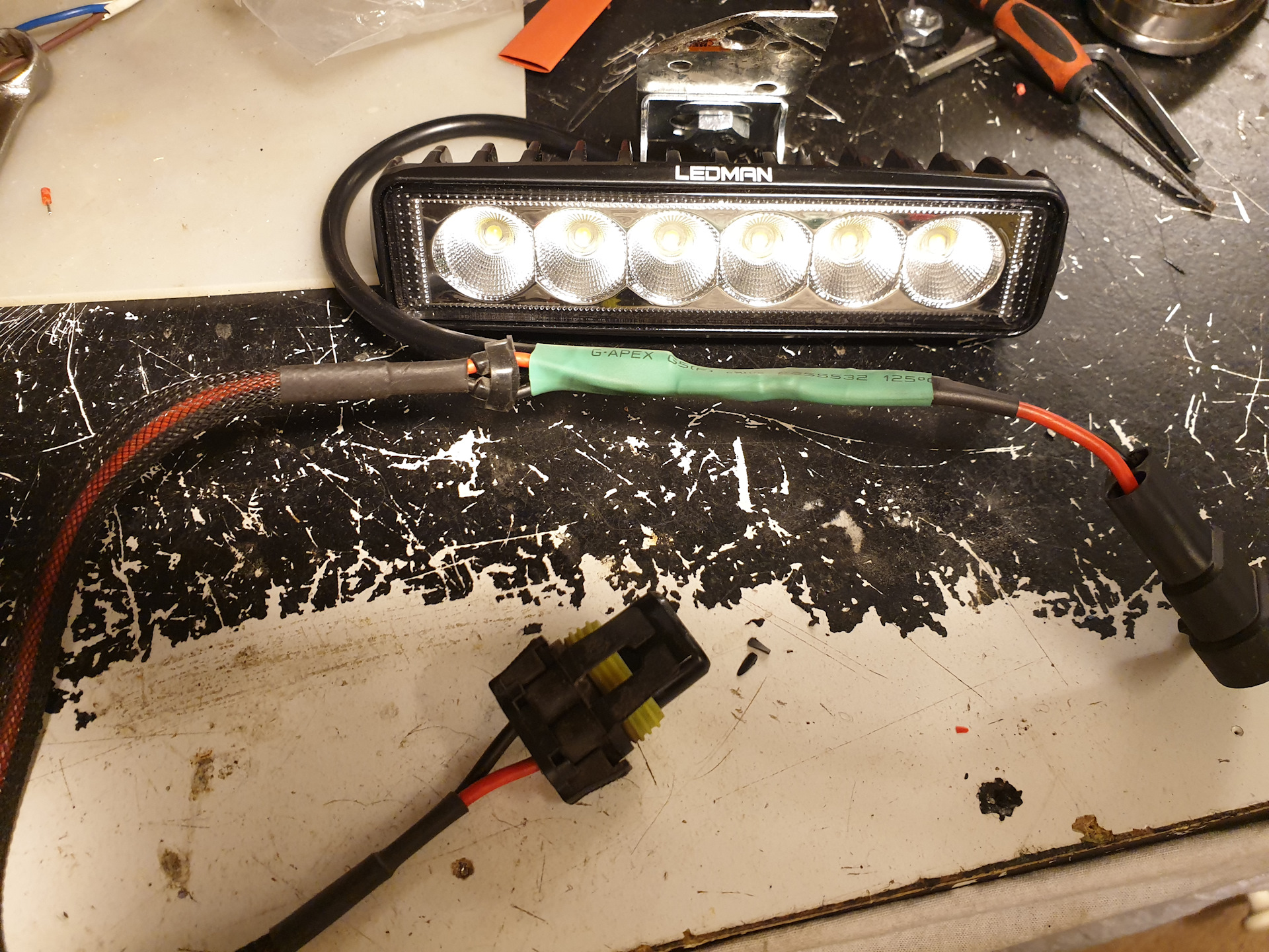 Для подключения использовал влагозащищенные герметичные разъемы типа 2х AMP, взял их из старых запасов ксеноновых блоков и ламп. Спаял штекеры и кабеля, спайки закрыл термоусадкой.