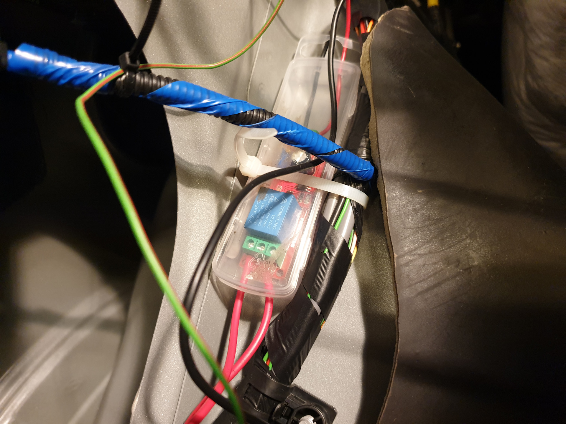 Далее в багажнике разобрал левую обшивку, в косе проводов нашел красный провод отвечающий за ЗХ и подключил к нему управление модулем задержки.