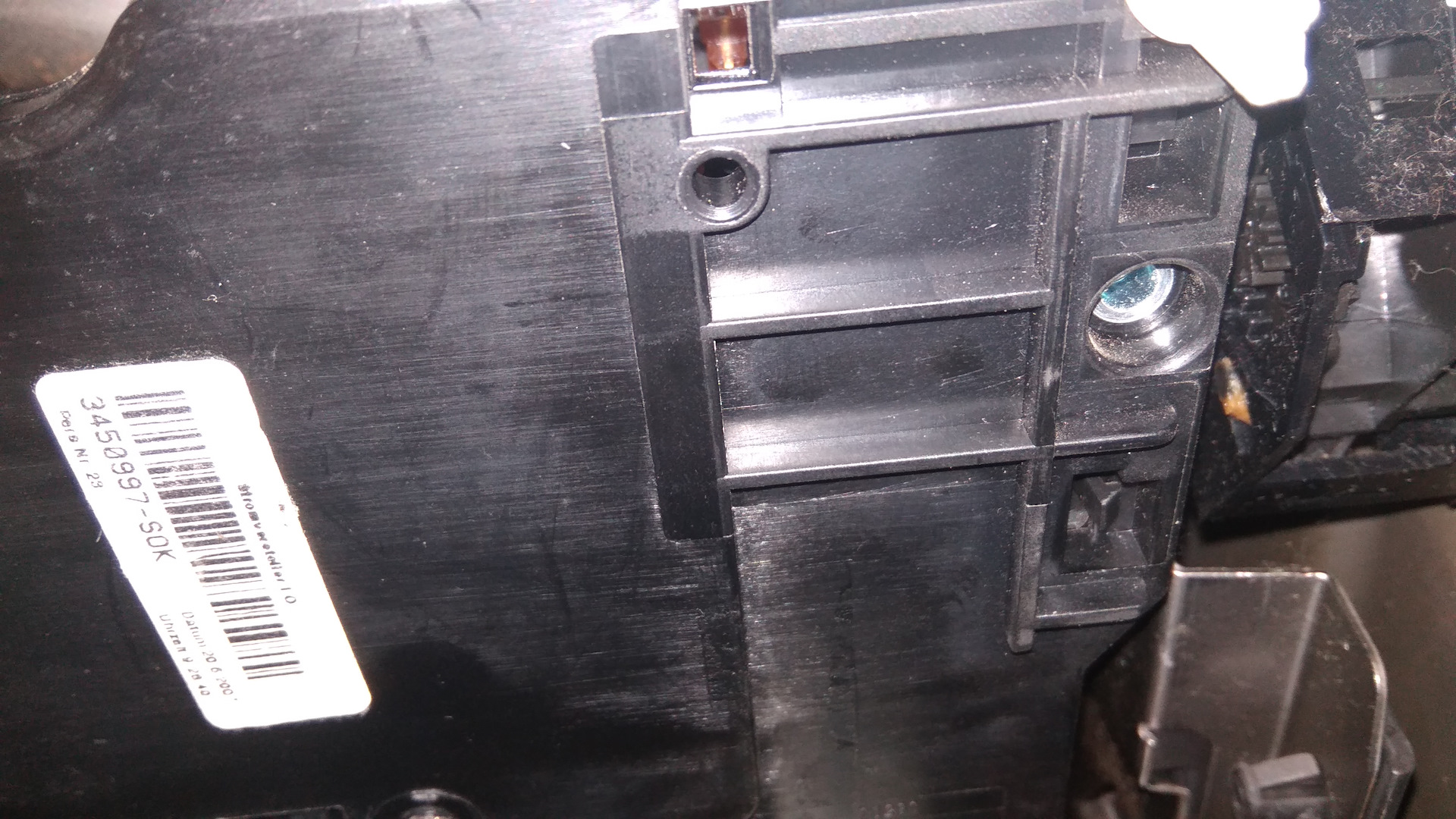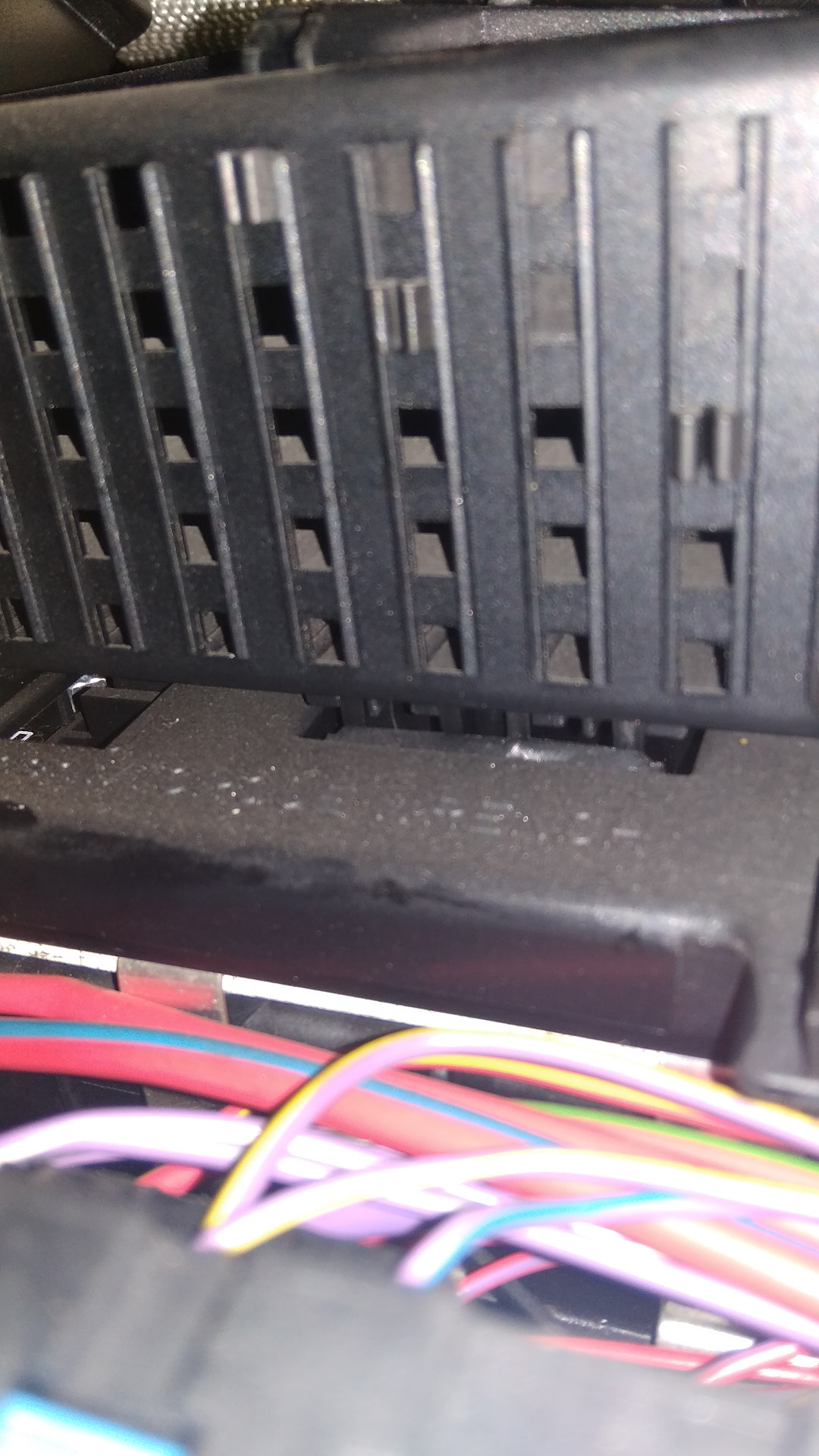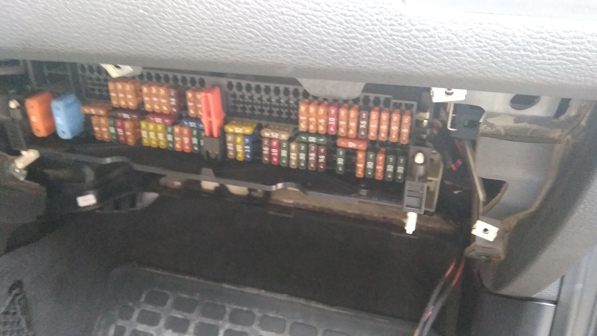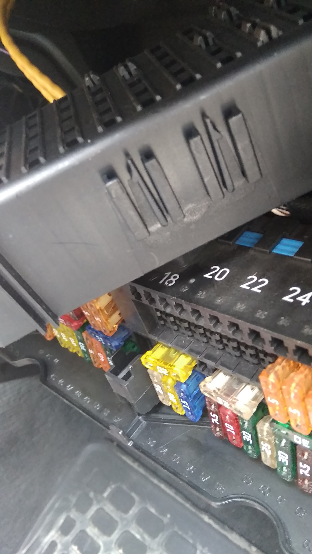 Р) Теперь ищем общий минус. Можно подключиться в любом месте к кузову но я сделал в точке соединения минусов. Отсоединяем питание подушки безопасности (ключа в замке зажигания быть не должно, аккумулятор можно не отключать, ничего не прописывается на выключенных цепях). На крышке предохранителей нажимаем два усика фиксатора друг к другу и толкам в сторону передка кронштейн гребешковых соединений. На салазках она снимается.