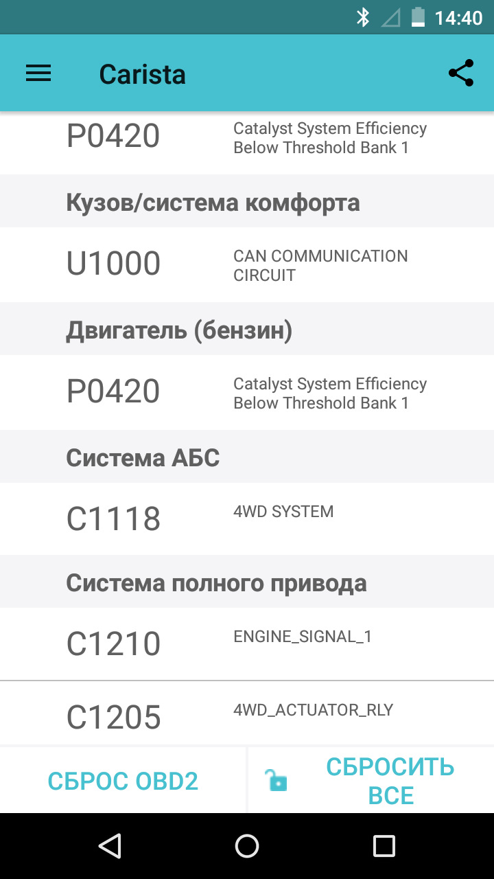 UPD: 04.05.20 через комментарии вышел на программу Carista. Программа обнаружила 3 новые для меня ошибки, которые не увидели такие программы как CVTz50, Torque и MotorData. Вот скрин ошибок.