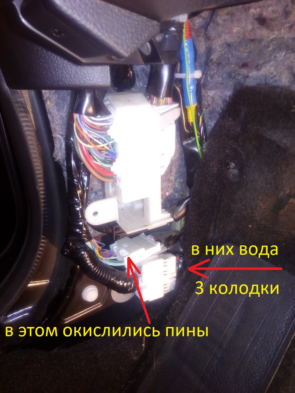 При протечке сверху (у меня машина с люком), вода затекает в 3 разъема рядом с левой ногой водителя.