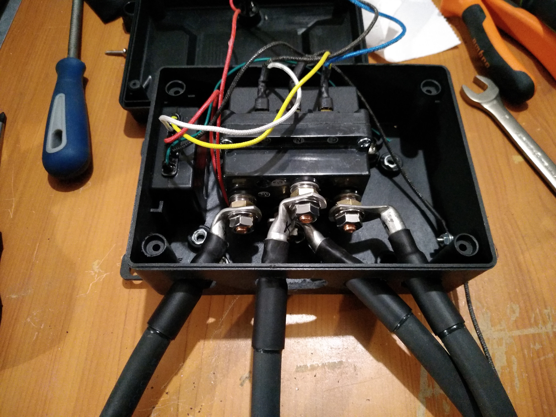 О подключении. Поскольку сам связан с электрикой по работе, подключение такого мощного потребителя без защиты электроцепи мне было не по душе, потому решил запитать цепь через предохранитель MTA 250А формфактора megaVAL ( www.mta.it/en/fuses, по время-токовым характеристикам тепловую защиту — срабатывание при токе 135% за время от 2-х мин. — имеют преды номиналом до 250А, номиналом 300-500А обеспечивают защиту только от токов превышающих двукратно номинал), держатель предохранителя www.12vi.ru/762/1072/9401.html, выключатель "плюса" AK-SA 06-017 на долговременный ток 250А/отключающий ток 2500А www.12vi.ru/763/856/5911.html (болты на 10мм), родные кабели 25 квадрат заменил на кабель КГ-ХЛ 35 квадрат (Кольчугинский, вроде как гостовский, хотя для кабеля 5-го класса гибкости диаметр многожильной жилы должен быть 9 мм, а тут где-то 8, но всяко больше, чем у родных проводов), наконечники под него аккурат нужны 35-8-9, термоусадку надо 18/6 можно даже с термоклеем, гофра разрезная 20 или неразрезная 25 мм. Для подключения кабелей в блок соленоида, наконечники пришлось гнуть и колхозить одно новое отверстие в корпусе.