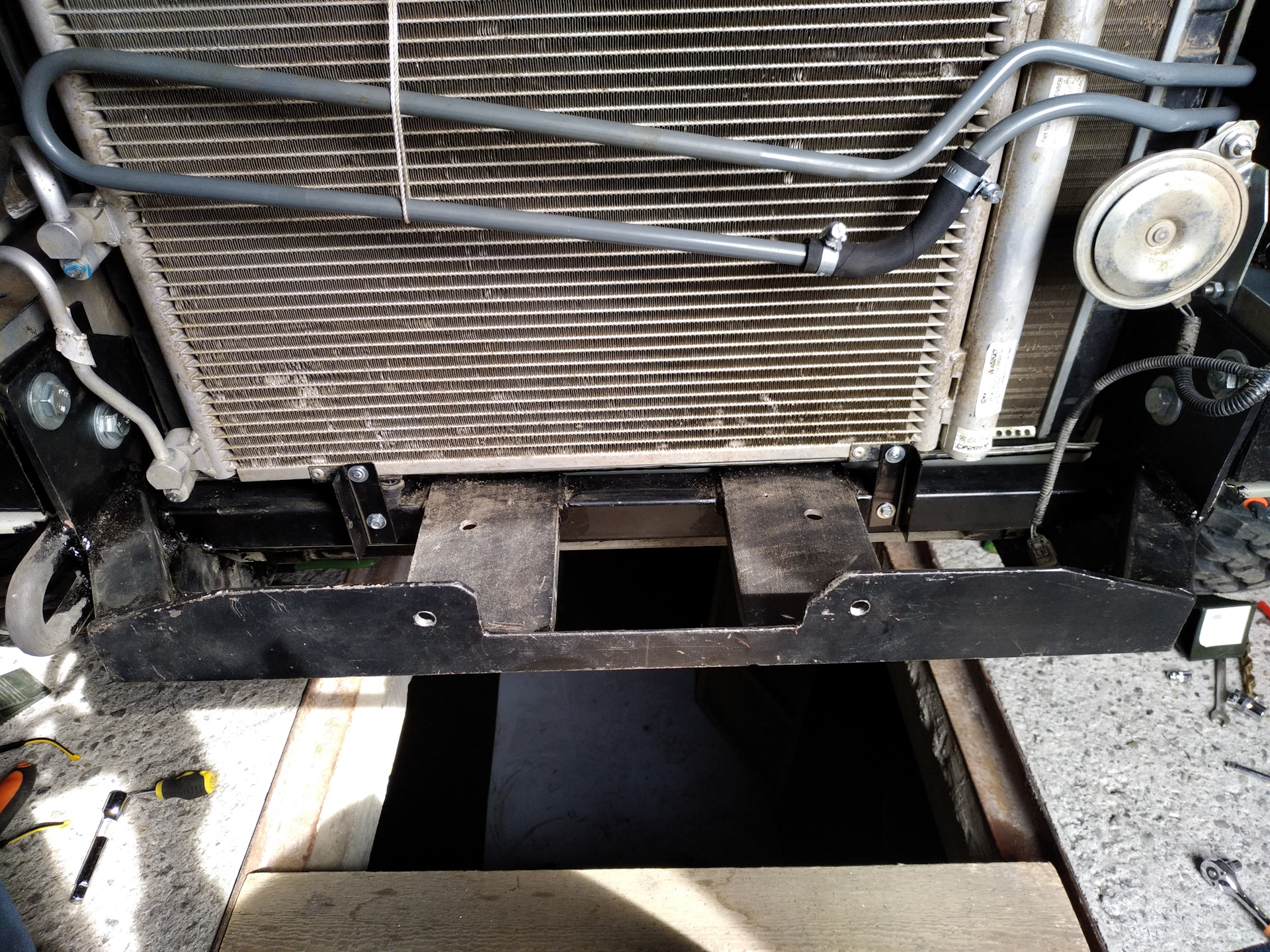 — для фиксации радиатора кондера, сдвинутого к основному радиатору и при этом немного поднятого, по линии профильной трубы крона снизу сделаны уголки