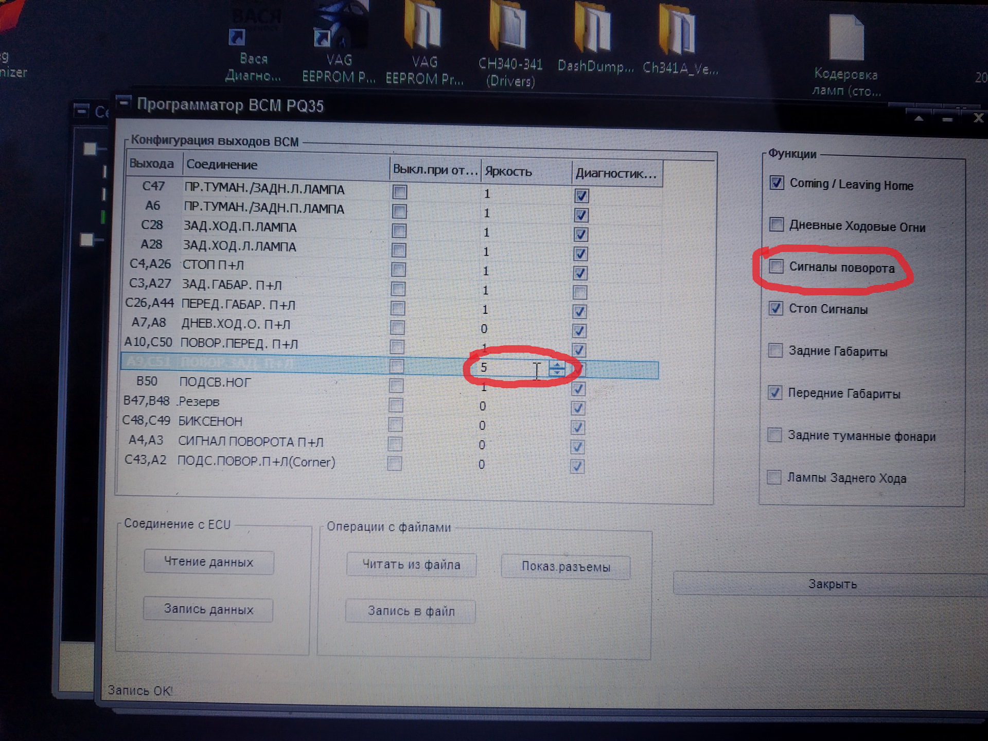 После с контактов А9 и С51 мы убираем галочку и уменьшаем яркость до 5
