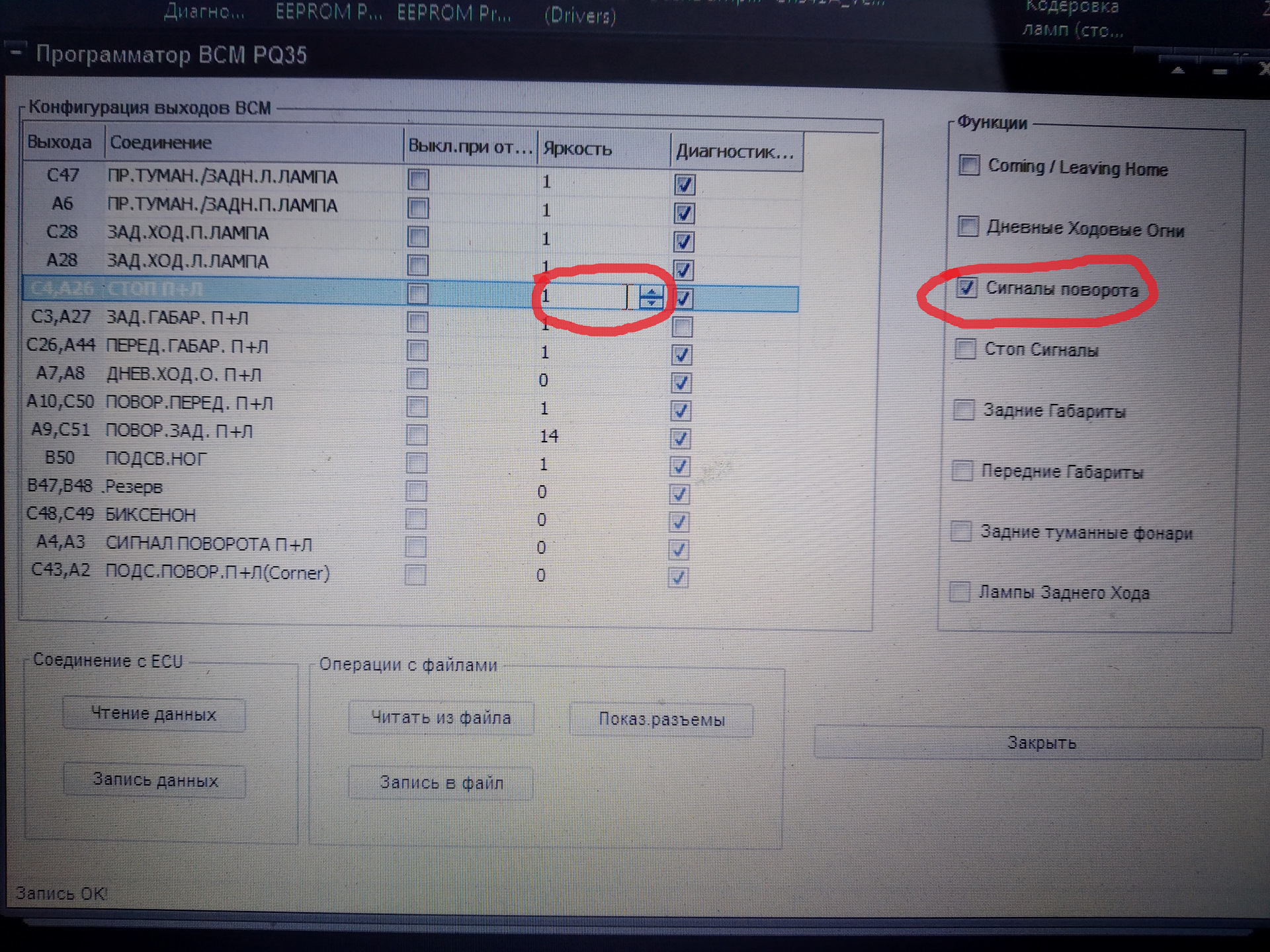 А на контакты А26 и С4 мы ставим галочку и увеличиваем яркость до 1