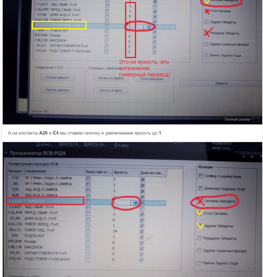 Таже беда. Нет опроса стопов (A9, C51) ну и новых поворотов (C4, A26). Удалось ли вам решить эту проблему? Т.к. переброской проводки возле фар не вижу смысла. Не пойму что могло послужить причиной?!