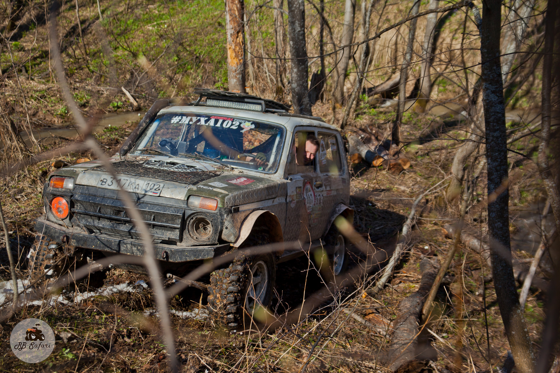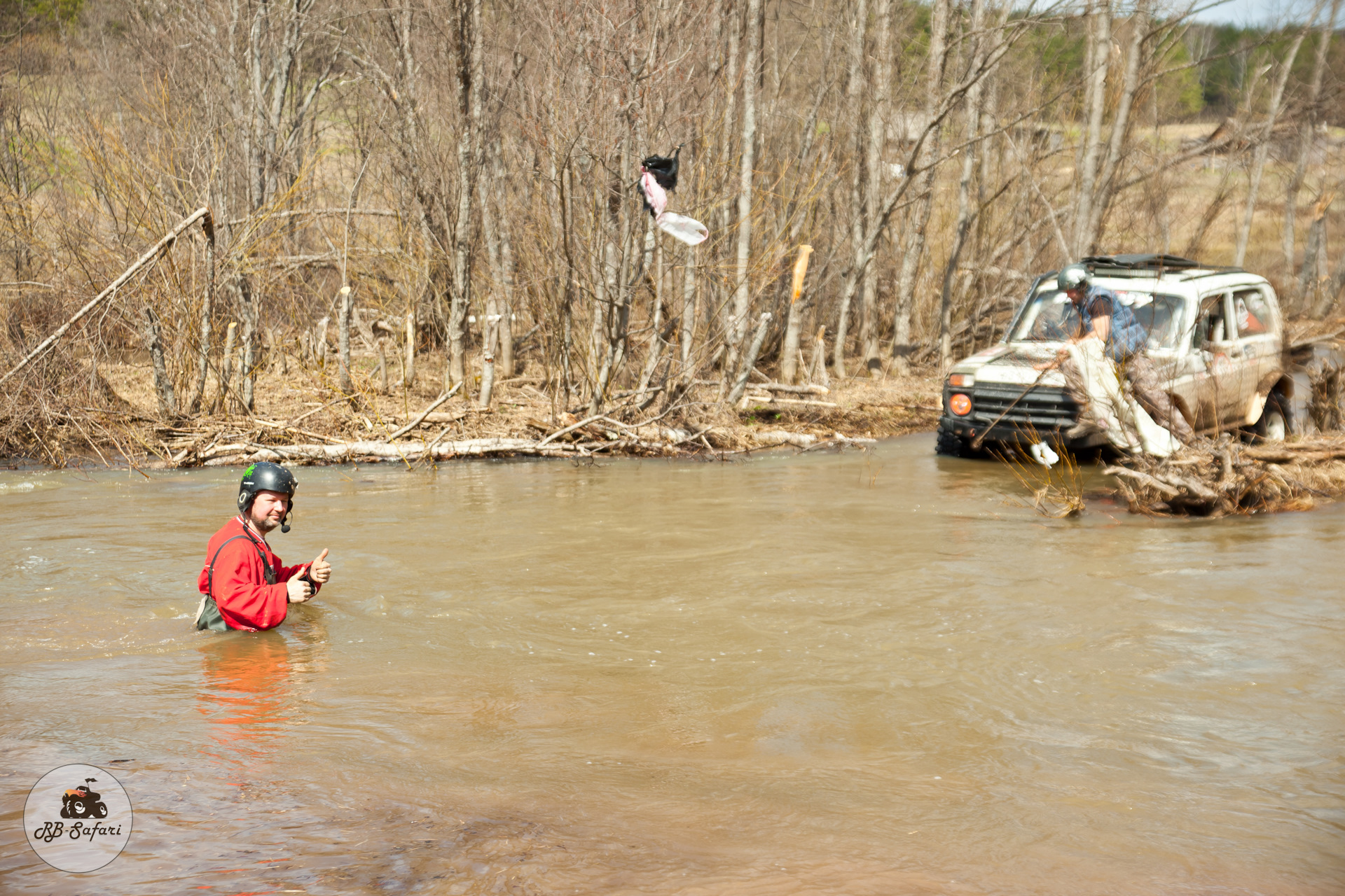 Прогулялись, посмотрели в «ускоренном» режиме и сейчас уже для нас главным стало выйти на связь. Задержались на сутки – естественно у многих ждущих нас в городе возникли вопросы. Кому задать вопросы? Естественно нашему другу и товарищу Алексею, который был хозяином сервиса A-Garage, где мы обслуживаем машины. ФОТО. Время 14.00 и мы решаем, вернее нам не остается выбора, как выходить через реку Урюк в посёлок Нугуш. Перед нами, всеми известная речка Куперлинка, где патрол садится ровно на два часа в ил. 16.00 – рубимся через лес. Необходимо засветло пройти реку. Пока наши тяжеловесы копаются в лесу – мы с Сергеем выходим на брод. Брод вроде нормальный, проходИм… а вроде и нет. Меня начинает колошматить. ладно тяжёлые машины – в них весу и высоты хоть отбавляй. Но Муха… Нива должна пройти полноценную речку в половодье. Каменные лица меня и Серёги никого не удивляют, а даже забавляют. Как передать свои эмоции, связанные с загадкой прохождения брода, особенно когда видишь, что двух динозавров в сцепке не сильно, но смывает по течению? Прошу Серёгу сесть на борт Патрола. Если ниву перевернёт в реке – у меня хоть будет возможность вылезти из машины. Грузим в багажник камни с берега. Загрузили около 200-250кг. Вопрос с плавучестью кормы вроде решён. В брод едем с открытыми дверьми на короткой сцепке за патролом. Фото до брода и фото после брода) Мы прошли его, а значит, что впереди нас ждёт связь. Время 21.00 четвёртого дня. Нашли связь. Огребли все. Наши друзья и знакомые из-за паники жен уже собрались ехать по нашему треку на помощь, за что я лично безумно благодарен. Но это было поспешно.