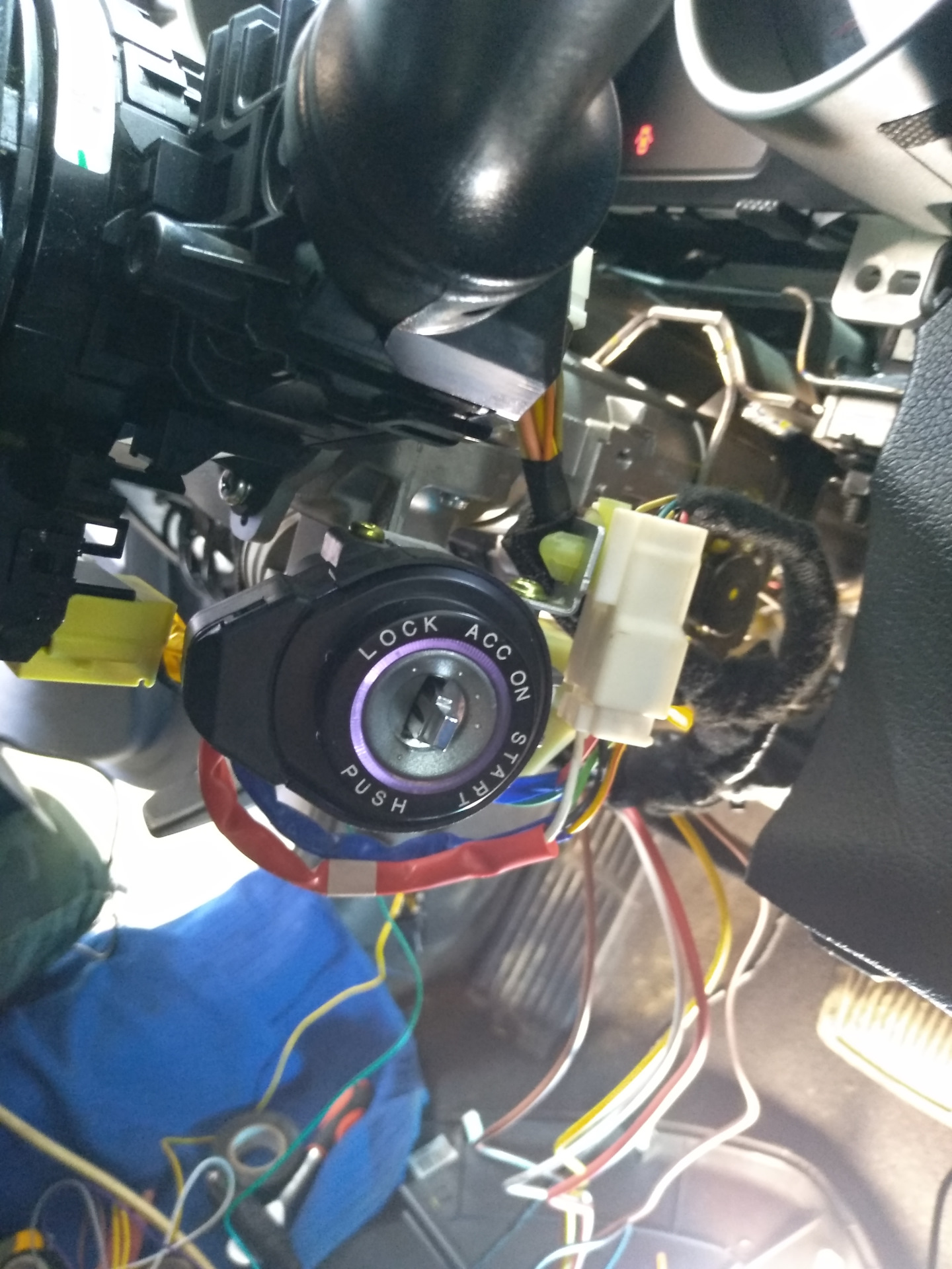 И так, для того чтоб поставить кнопку нужно делать что то с замком. Первый вариант снять его, второй вариант, вытащить жило из ключа и провернуть его до состояния АСС, чтоб не клинило руль. Второе и самое важное откусить провод с зуммером.