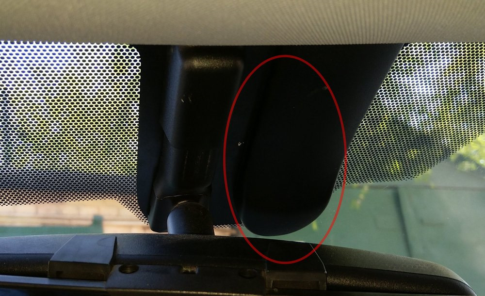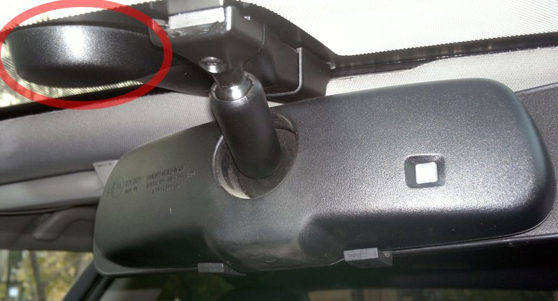Датчик, который реализует нам режимы "автодождь" и "автосвет", можно увидеть, отогнув салонное зеркло заднего вида вниз: