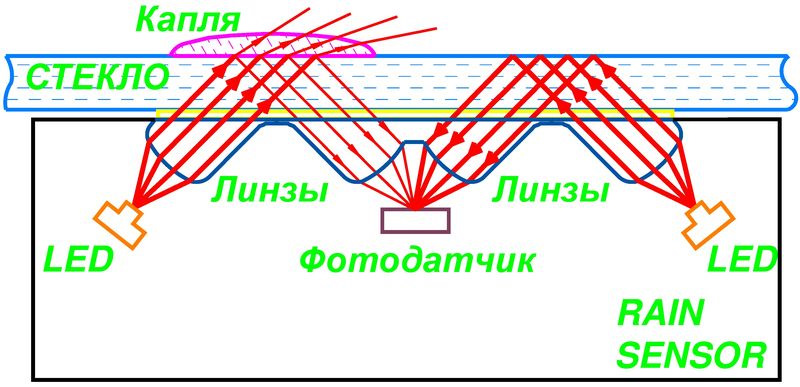 Таким образом, датчик реагирует не на дождь, а на любое загрязнение, которое вызовет отток ик-лучей на себя.