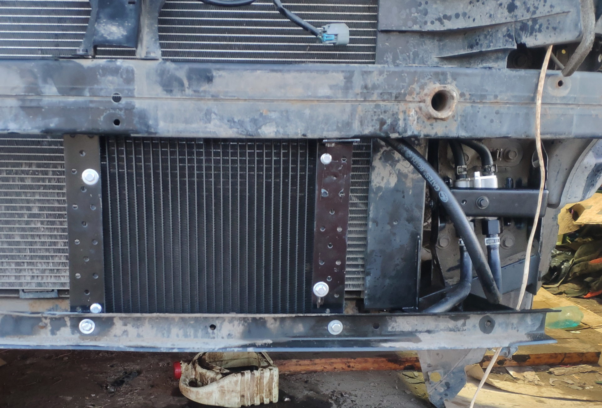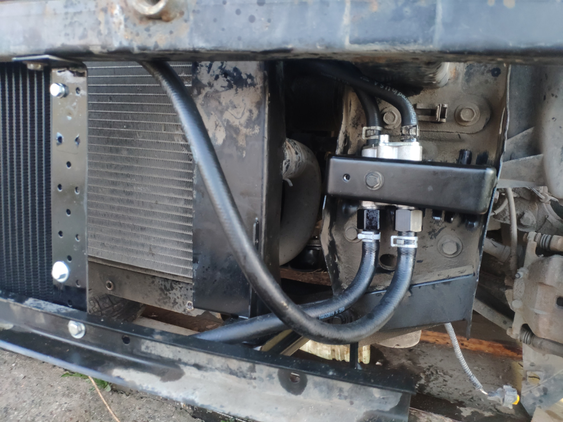 Если масло меняли, не снимая аккумулятора и его опоры, то пора это сделать, снимать/надевать шланги теплообменника будет гораздо удобней. Снимаем старые шланги и трубки вместе с кронштейном. После долгой примерки выбрал место для термостата: