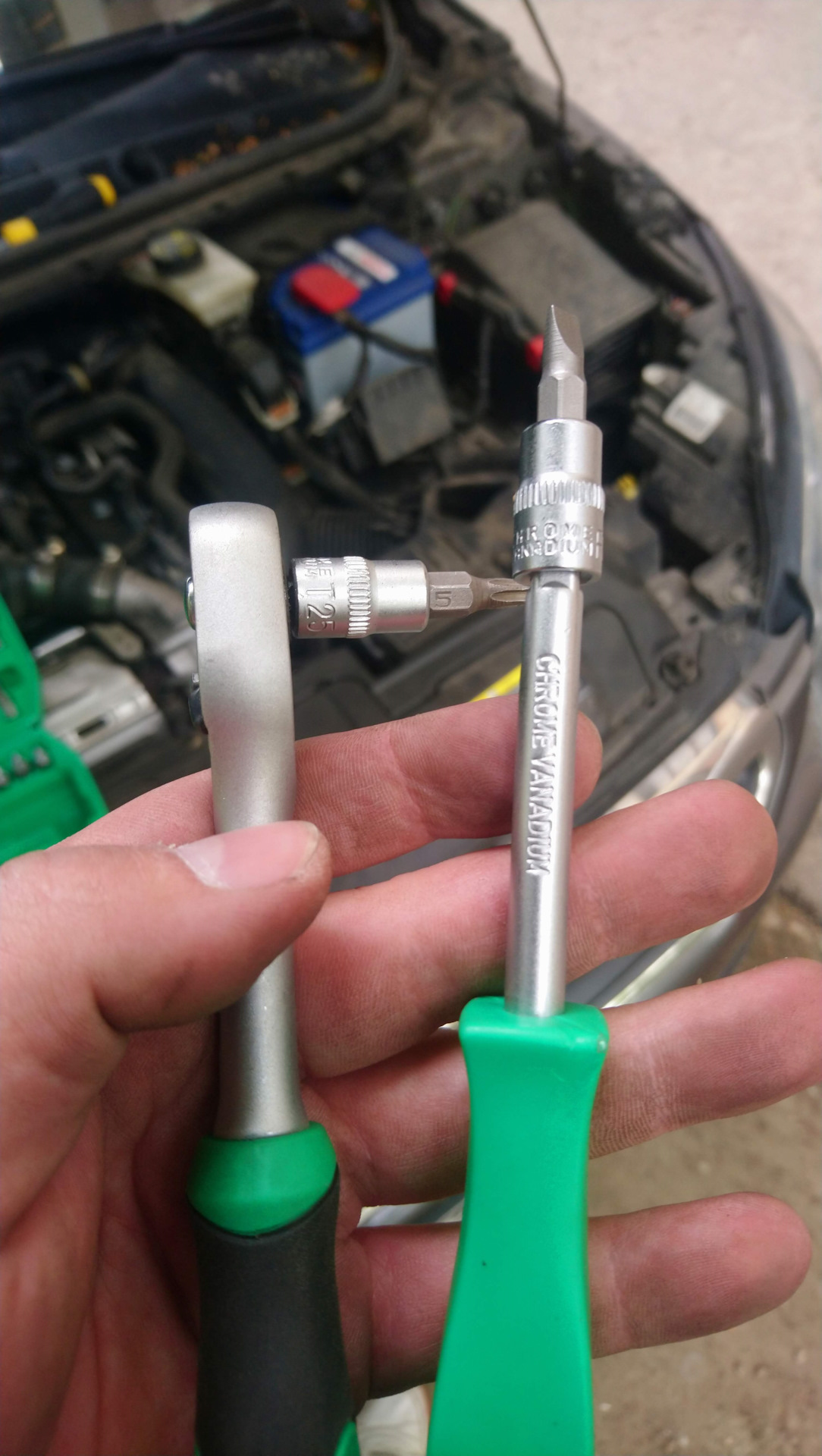 Надо будет: трещотку, звездочку на 25 и плоскую отвертку.