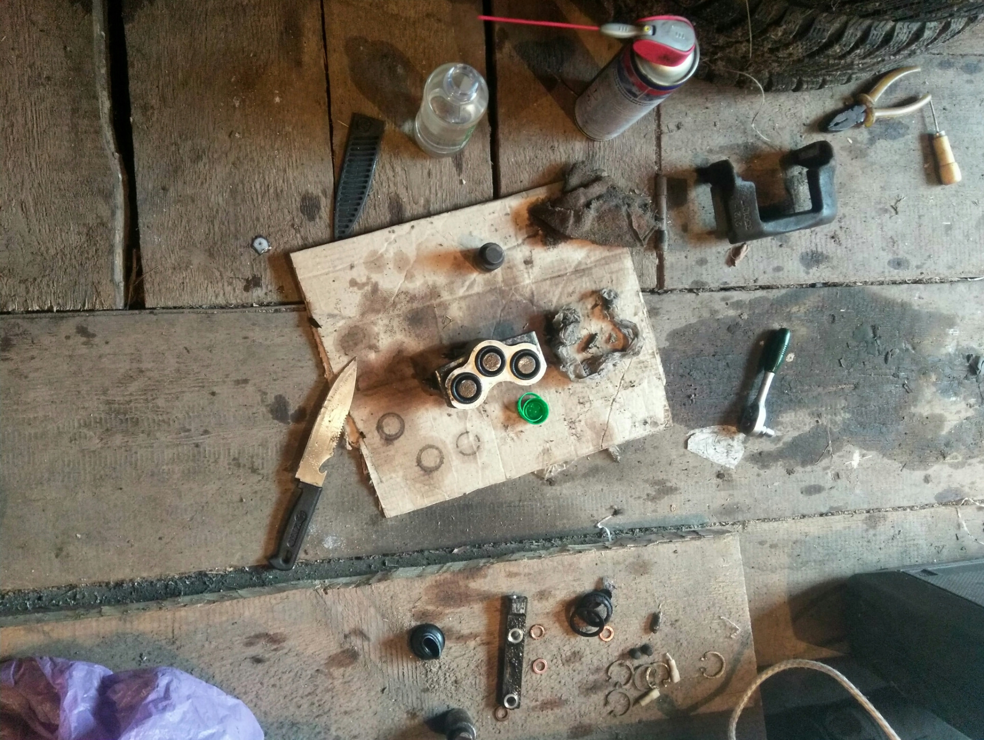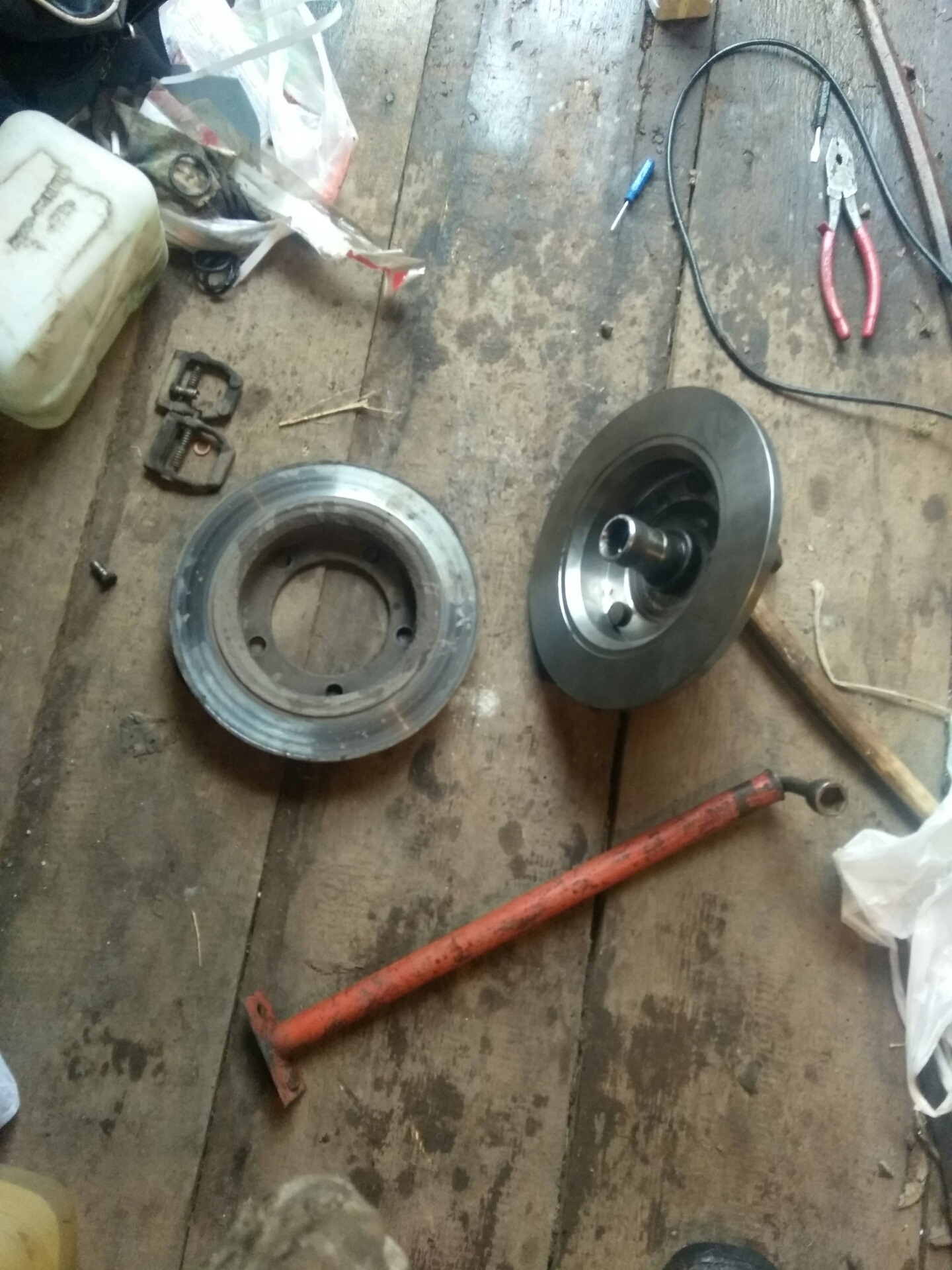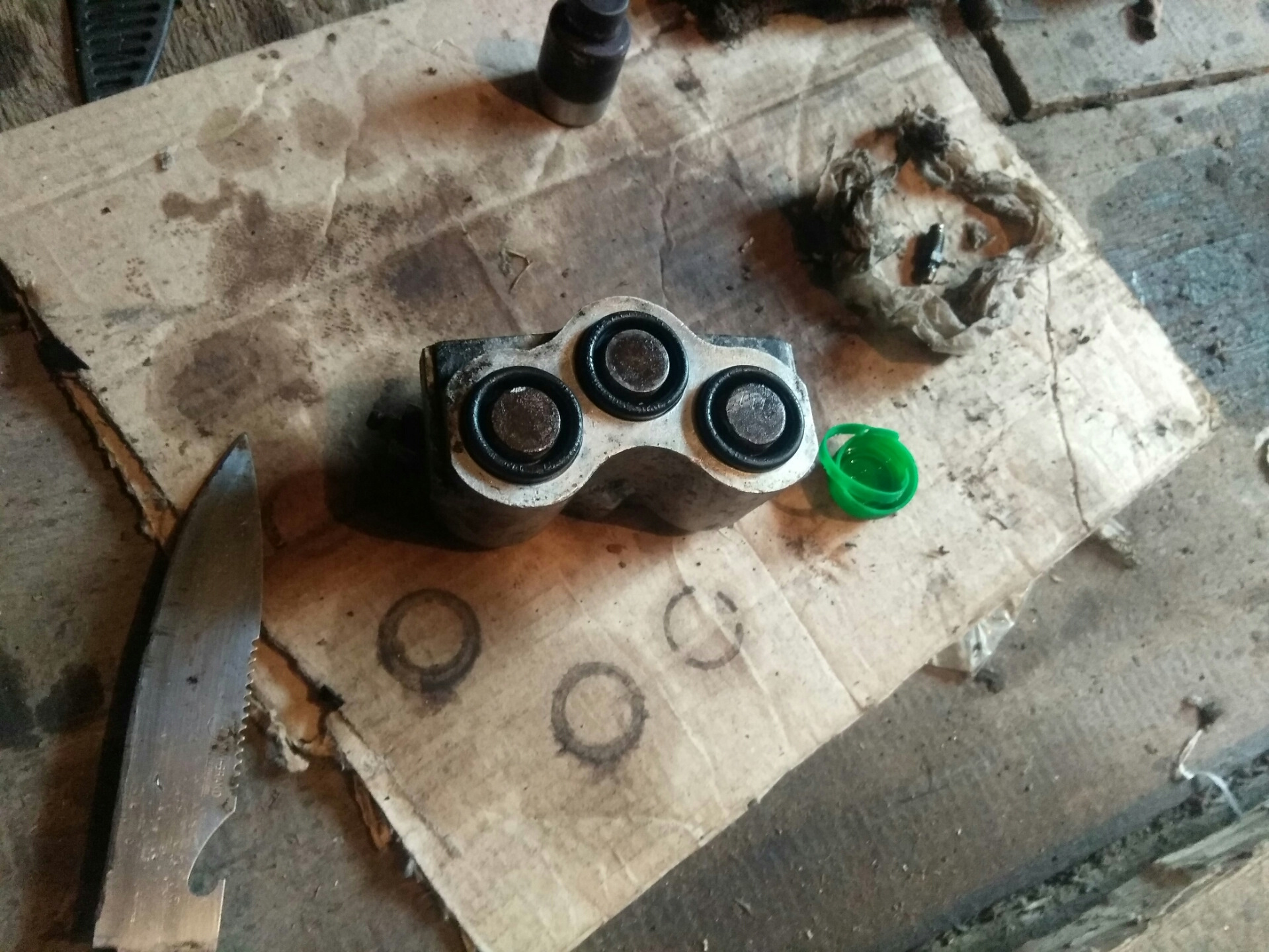 Пока был в деревне на майских праздниках, занимался передними тормозами, с правой стороны закис средний цилиндр, с левой колодку ело по диагонали со стороны суппорта, хотя вроде все двигались. Заменил тормозные диски (2 т.р.). Покупал Рем комплект суппорта(резинки), зря не купил цилиндрики, и из двух закисших собрал на правую сторону. На левую брал новый (850р), не оригинал, не вспомню производителя. Так же лопнул тормозной шланг на левой стороне, лежал уже купленный, заменил. Планки суппортов тоже ждали своего часа (150р х2). Колодки брал самые дешёвые Riginal кажется (240р).