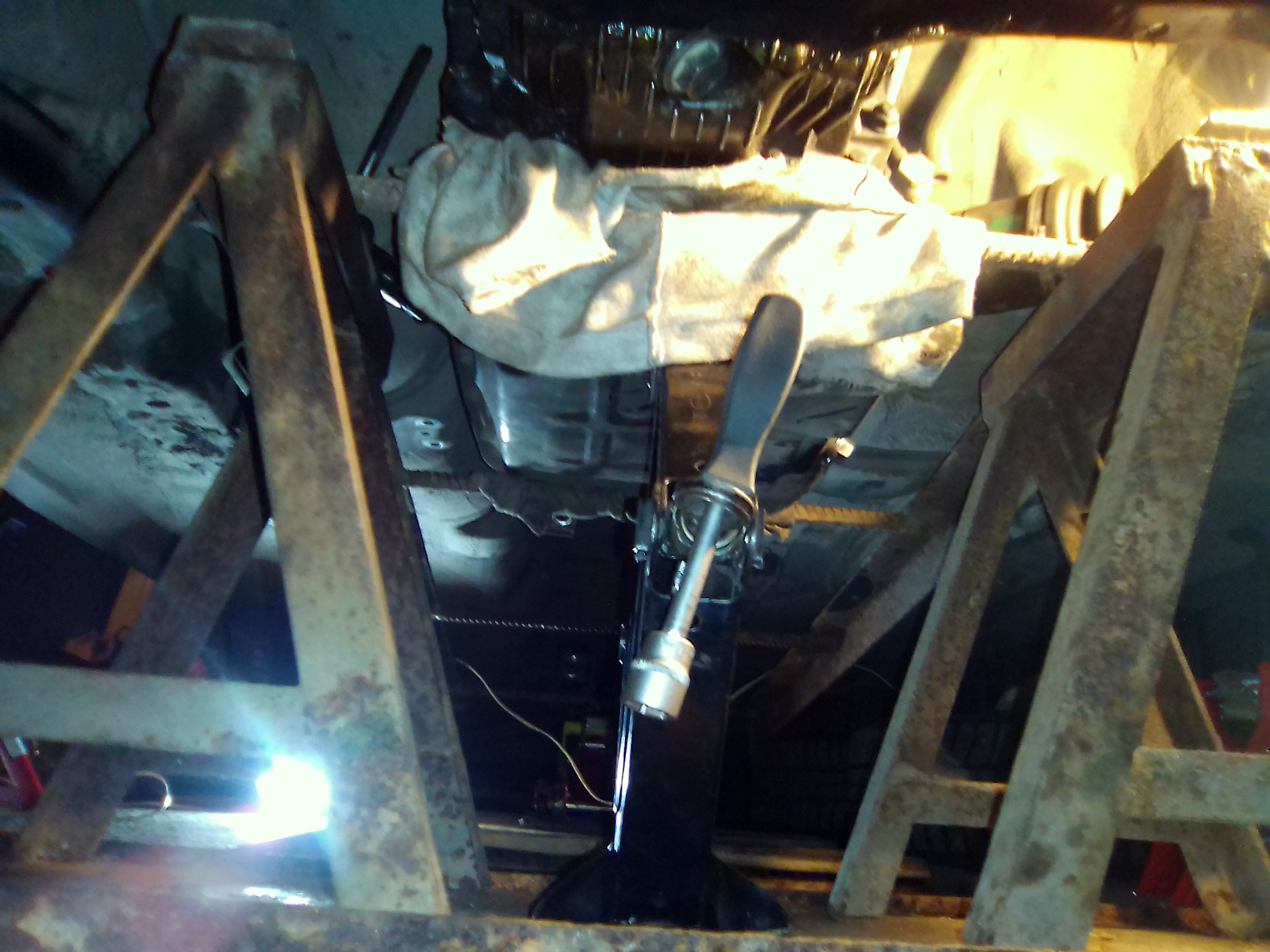 Для поддержки АКПП при снятии использовал две подставки от бывшей лавочки, лестницу из арматуры, домкрат-ромб спереди и подкатной с задней стороны. Проще говоря, положил лестницу на два домкрата и в процессе снятия маневрировал этой плоскостью. Из удобств лестницы то, что между ступеньками удобно разместился поддон коробки, то есть всех проблем с его замятием при демонтаже у меня не было.