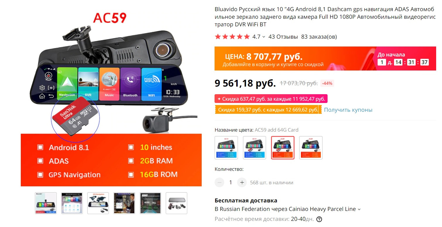 Сегодня мне доставили Зеркало 10 " с DVR поддержкой двух камер, 4G, Android 8.1, ADAS, GPS NAVITEL и ещё куча всякой андроидной хрени,