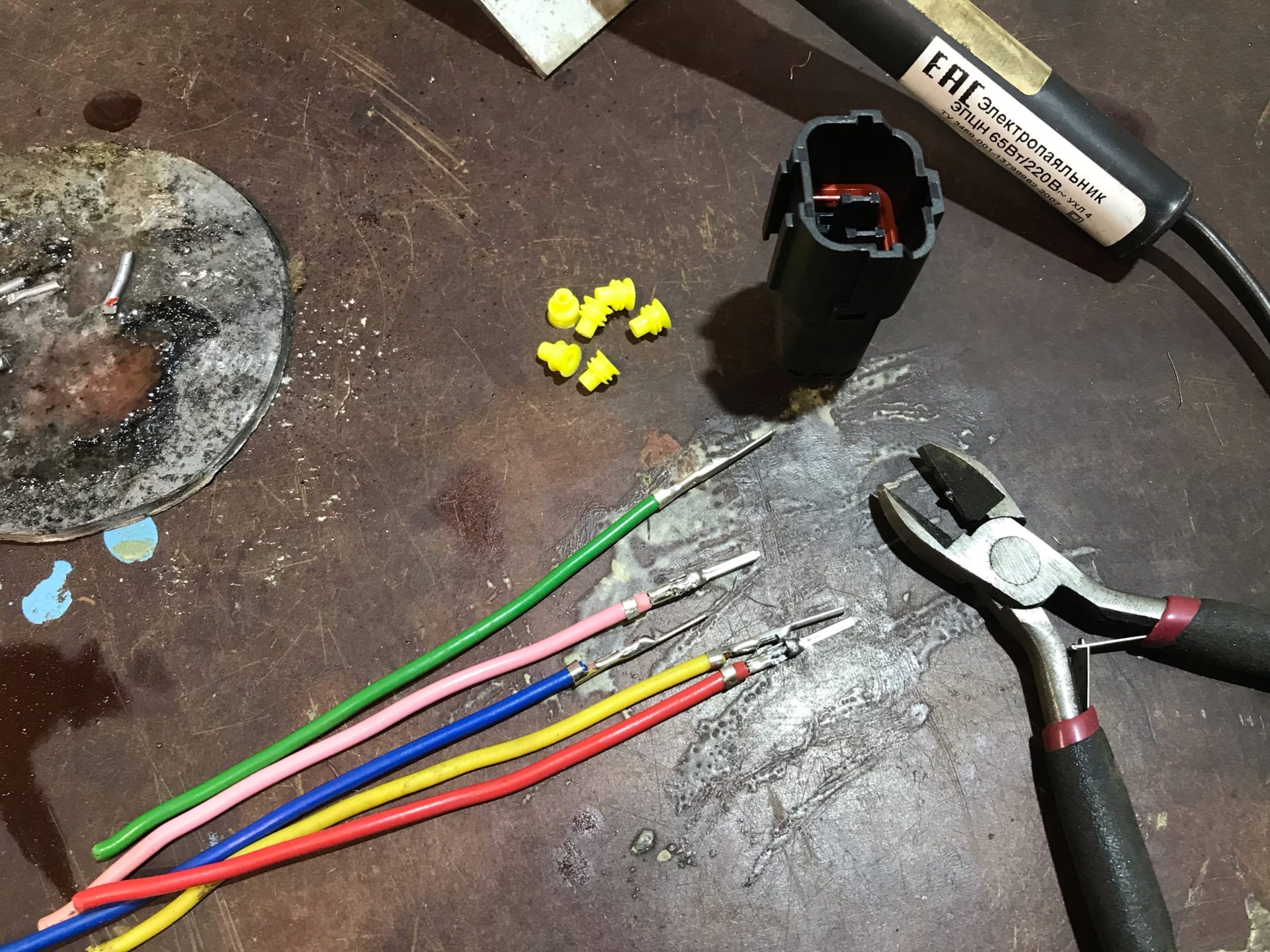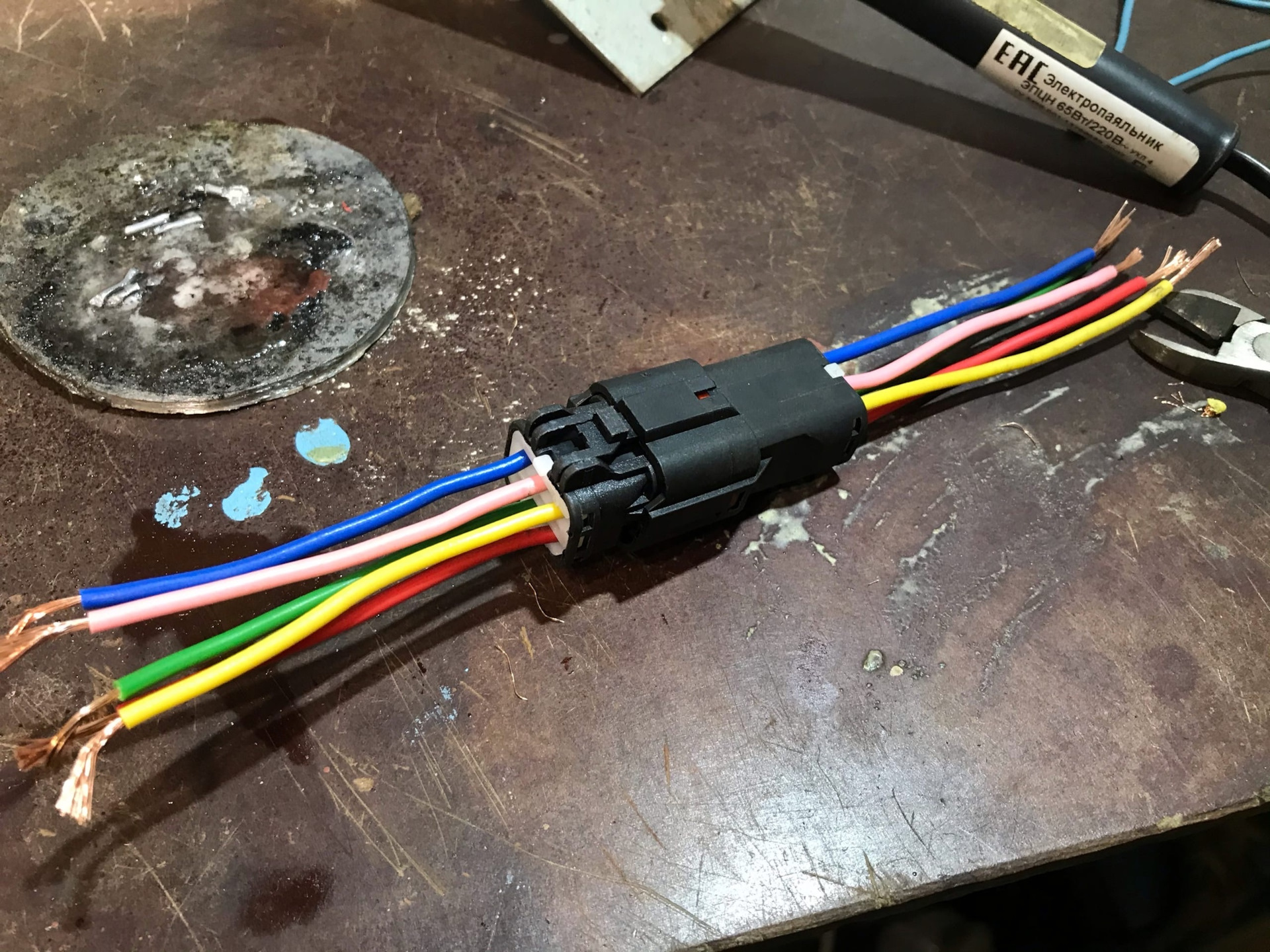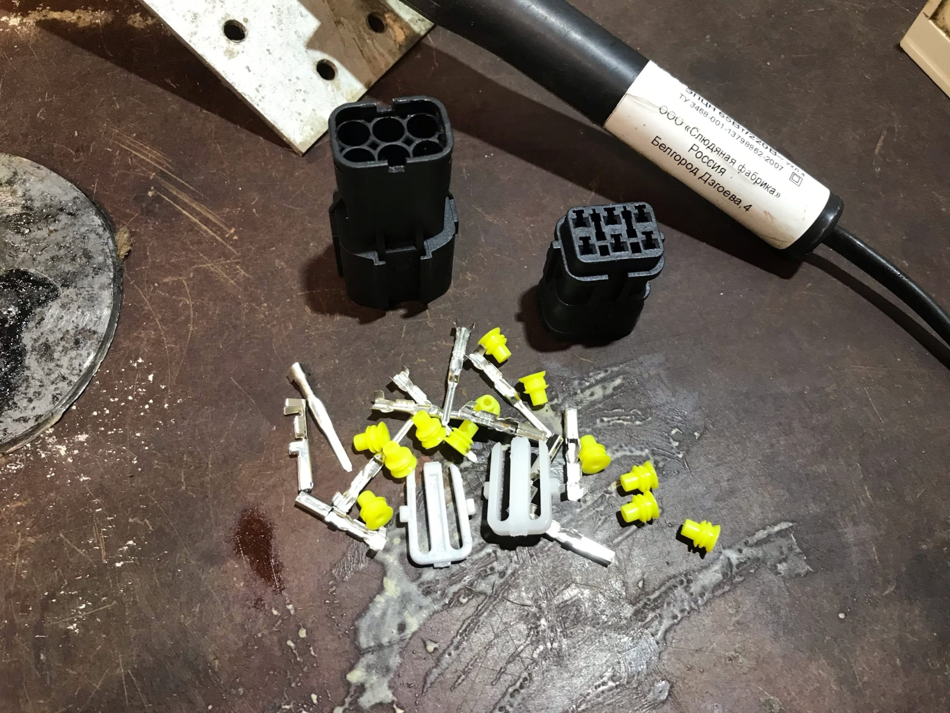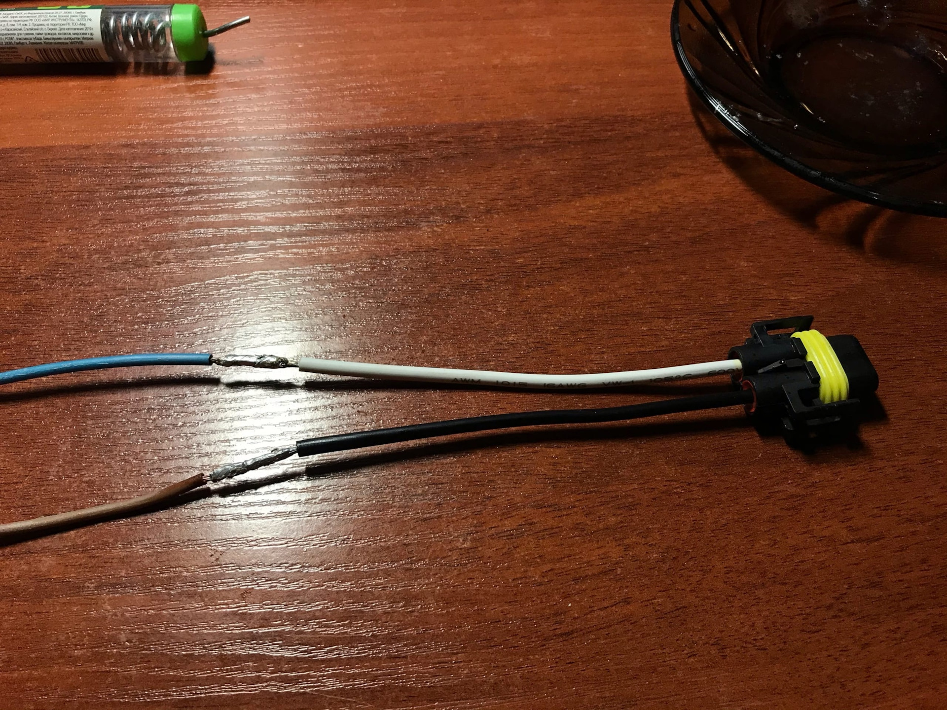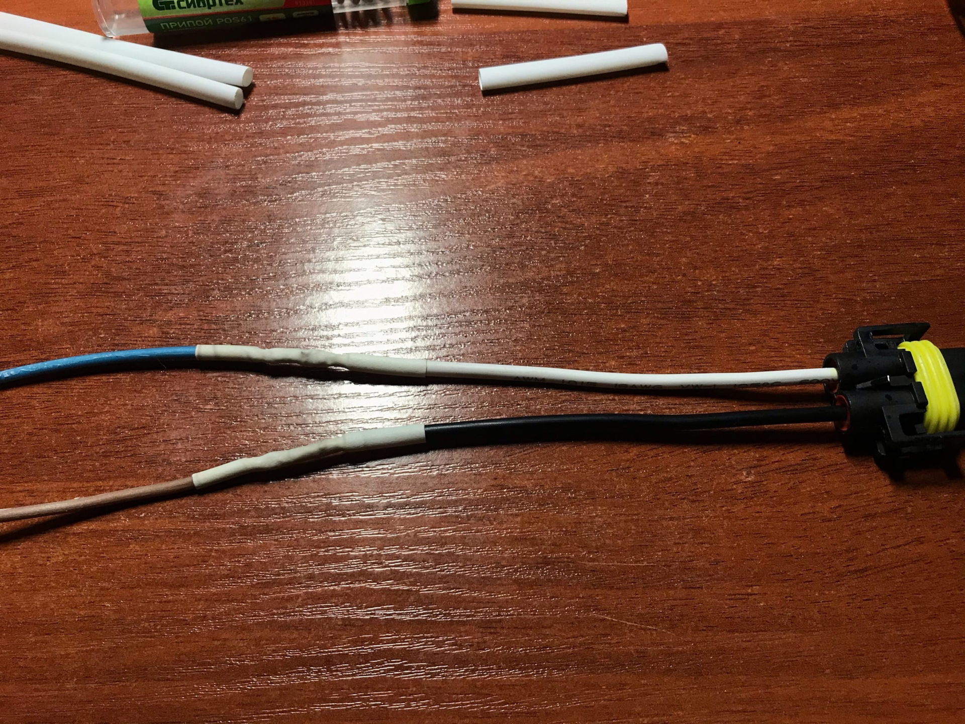 Это надо было сделать ещё в тот раз, но что то было лень. Купил новые патроны H8/H11 для ПТФ и один комплект 6-контактного разьема (папа/мама).Провода на самом входе в заводской Н8 патрон перегнили внутри, на фото мб не очень видно, но на ощупь сразу понятно что им хана. Разьем на 6-контактов был разборный и упакован по комплектующим, пришлось пропаять все контакты и собрать. В косе у нас идёт пять проводов, три из них идут на ПТФ и два на датчик наружней температуры.