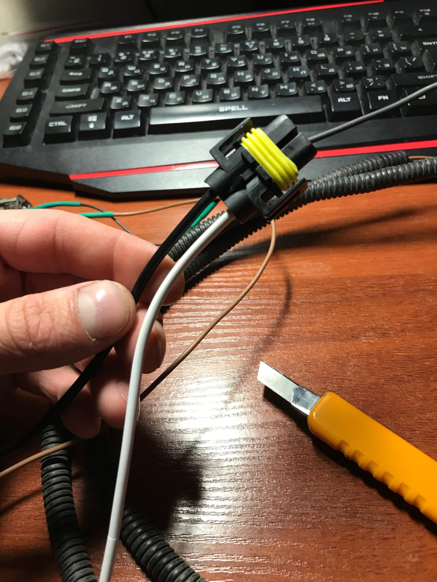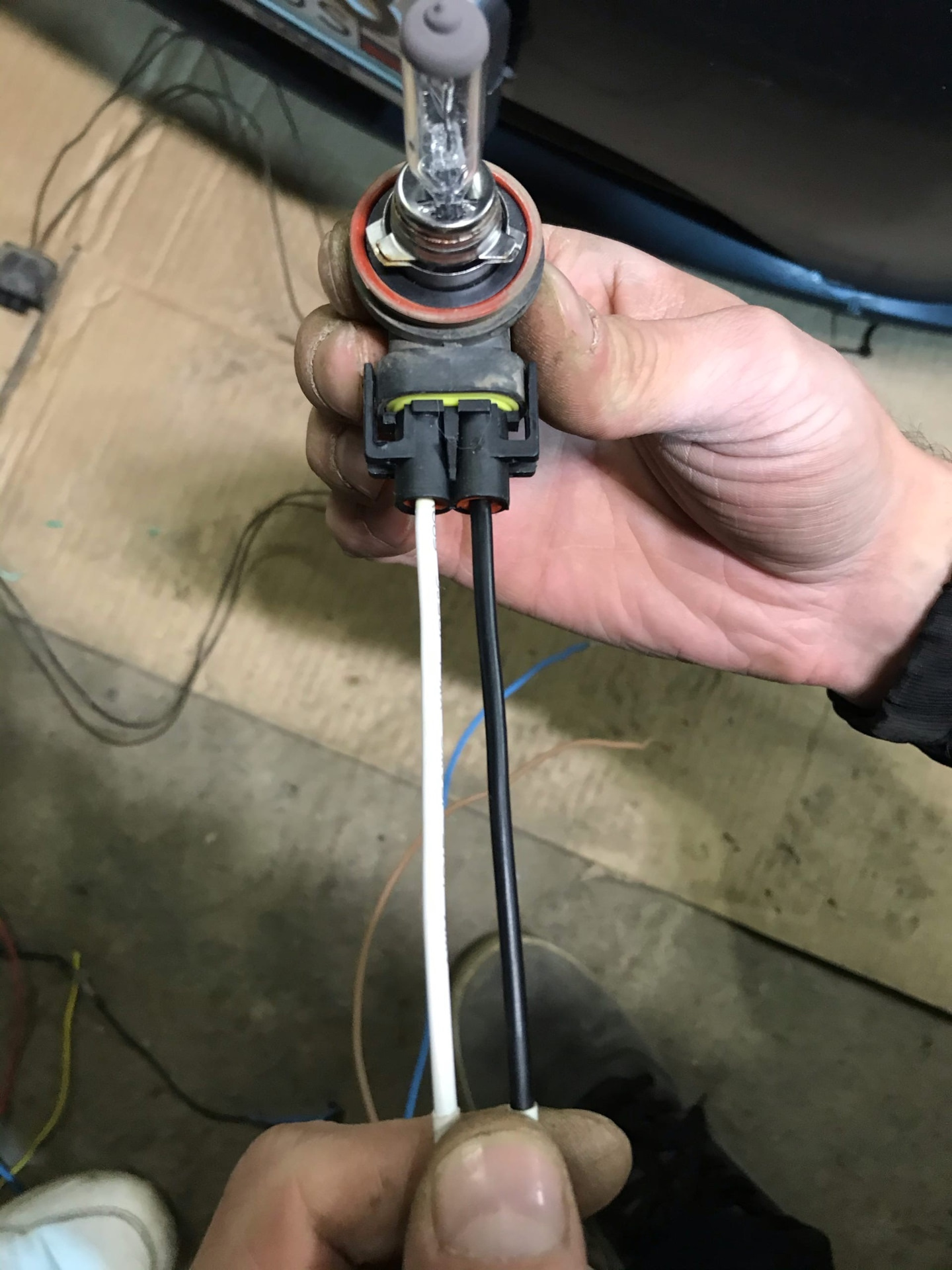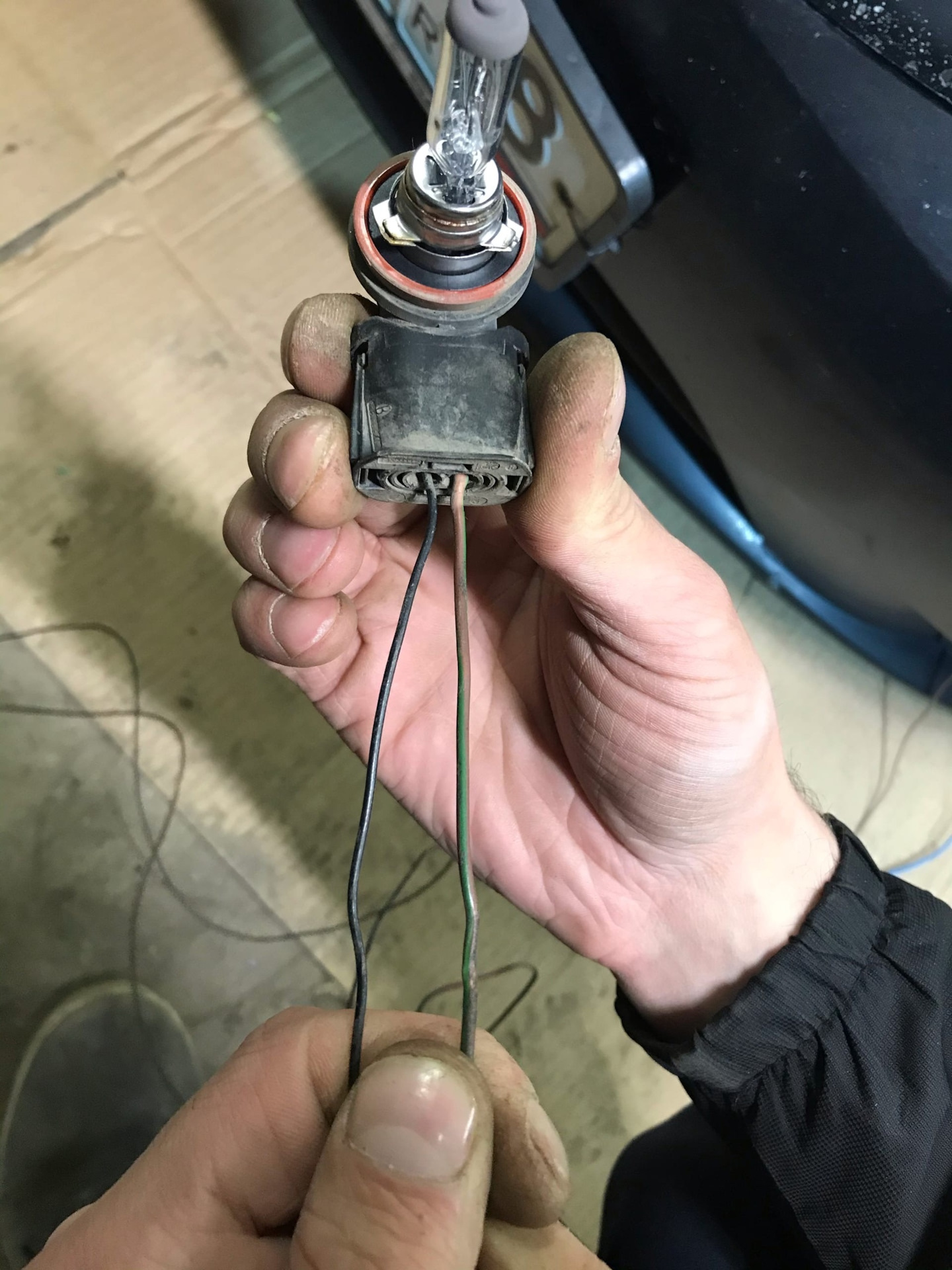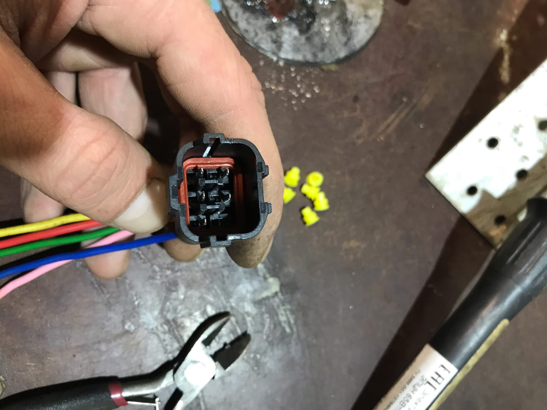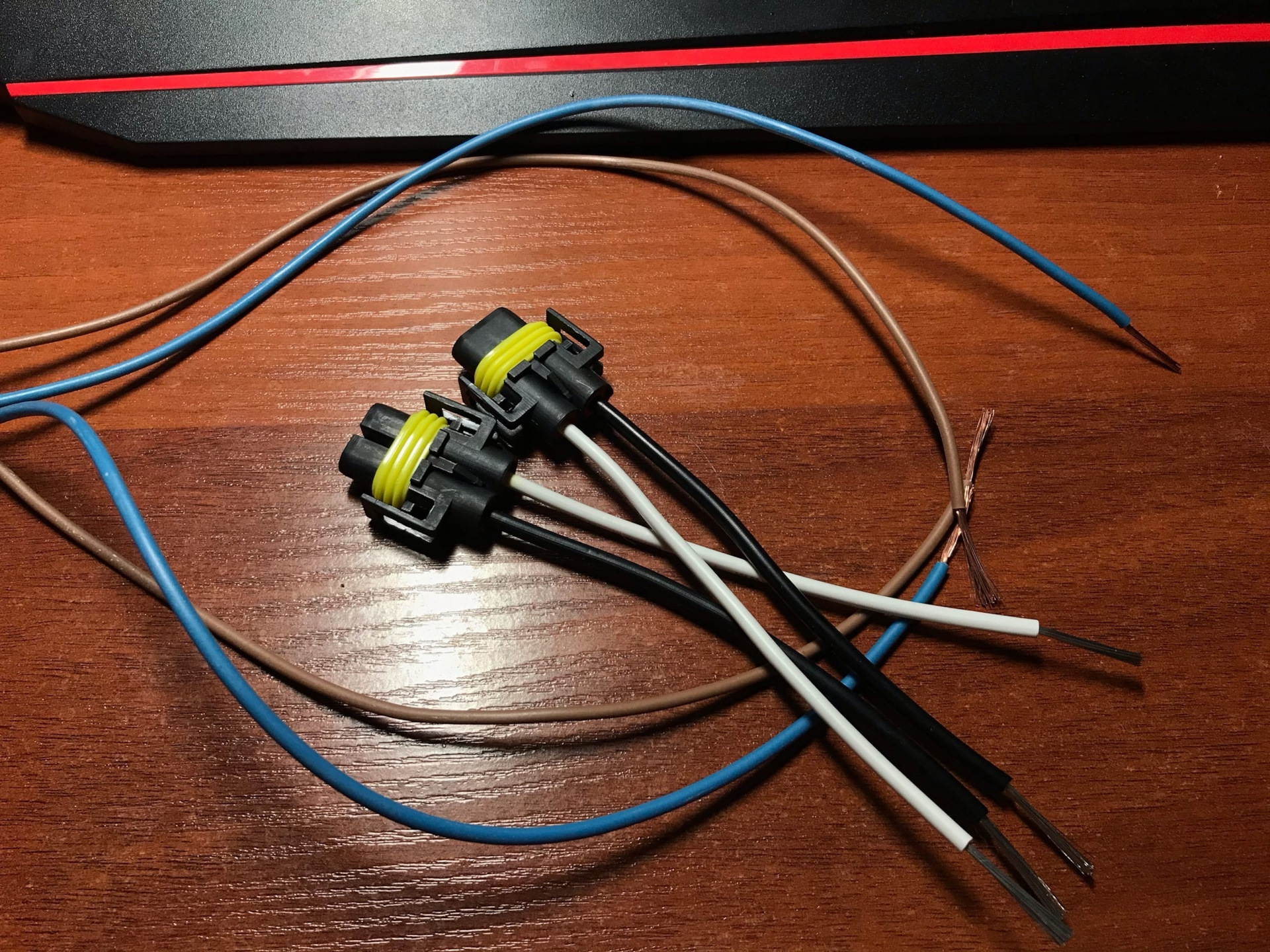 Это надо было сделать ещё в тот раз, но что то было лень. Купил новые патроны H8/H11 для ПТФ и один комплект 6-контактного разьема (папа/мама).Провода на самом входе в заводской Н8 патрон перегнили внутри, на фото мб не очень видно, но на ощупь сразу понятно что им хана. Разьем на 6-контактов был разборный и упакован по комплектующим, пришлось пропаять все контакты и собрать. В косе у нас идёт пять проводов, три из них идут на ПТФ и два на датчик наружней температуры.