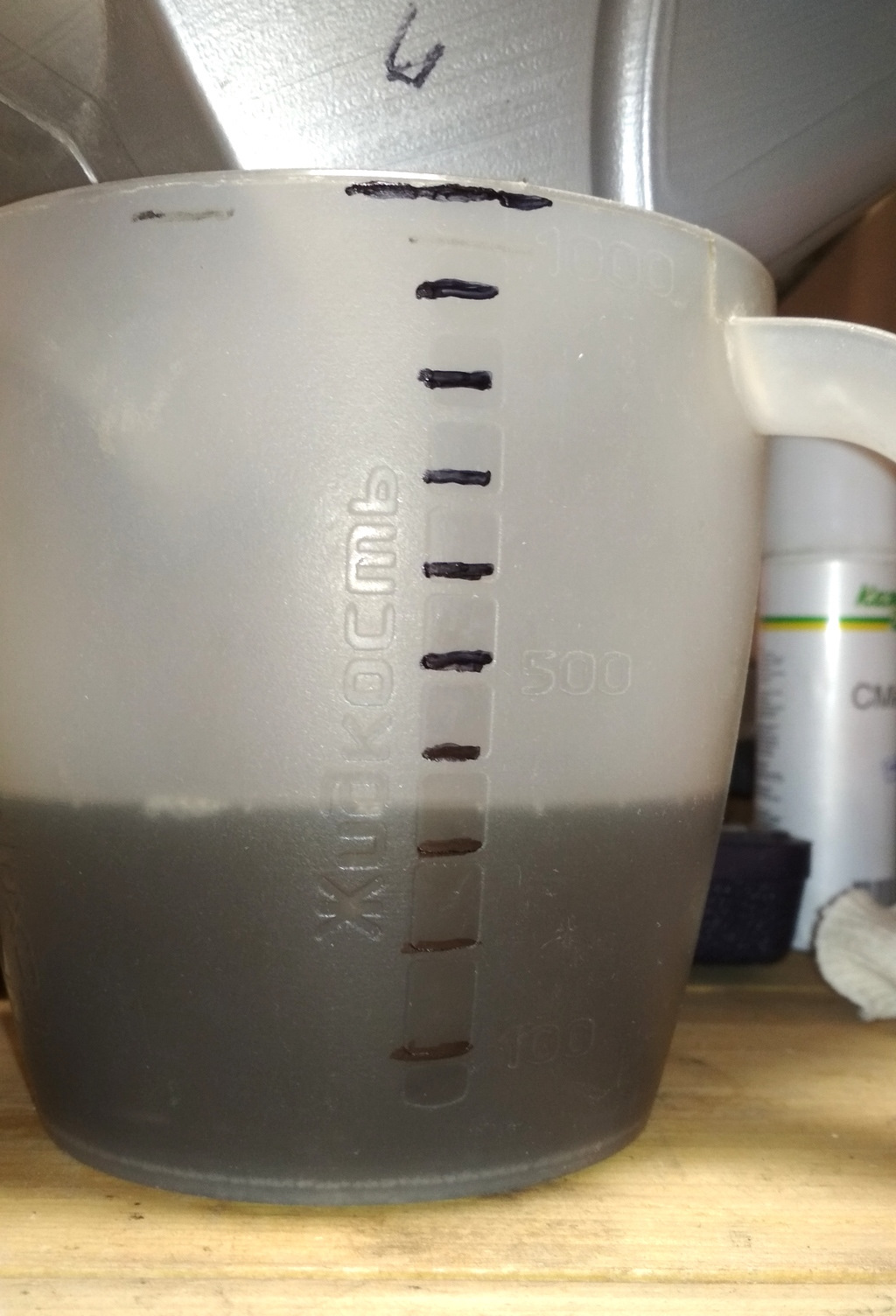 Разметил маслостойкую тару, заливая туда, точно по 100 миллилитров воды и слил масло из КПП.