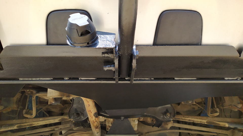Защиту Мотодор покупал ещё без лючка. Потом решил установить фаркоп и пришлось самостоятельно делать вырез. Сделав вырез понял что у защиты ослабла продольная жестокость, дополнительно по всей длине приварил стальной прут D- 16 для усиления.