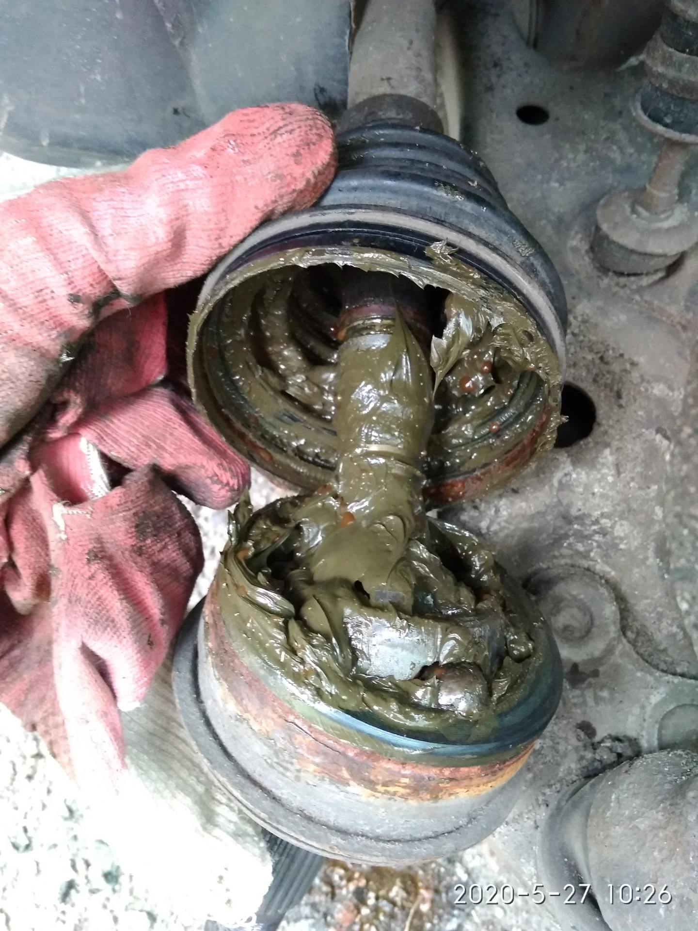 Начал копать что же там хрустит и стучит. Стучало гда то в ногах, скорее всего левый трипод тоже немного устал. А хрустел конечно же левый шрус, полез разбираться почему. Оказалось порвался пыльник, причем порвался очень коварно, прямо около внутреннего маленького хомута, в итоге смазкой он почти не кидался, зато воды набрал в себя пол стакана… Вот такая красота там