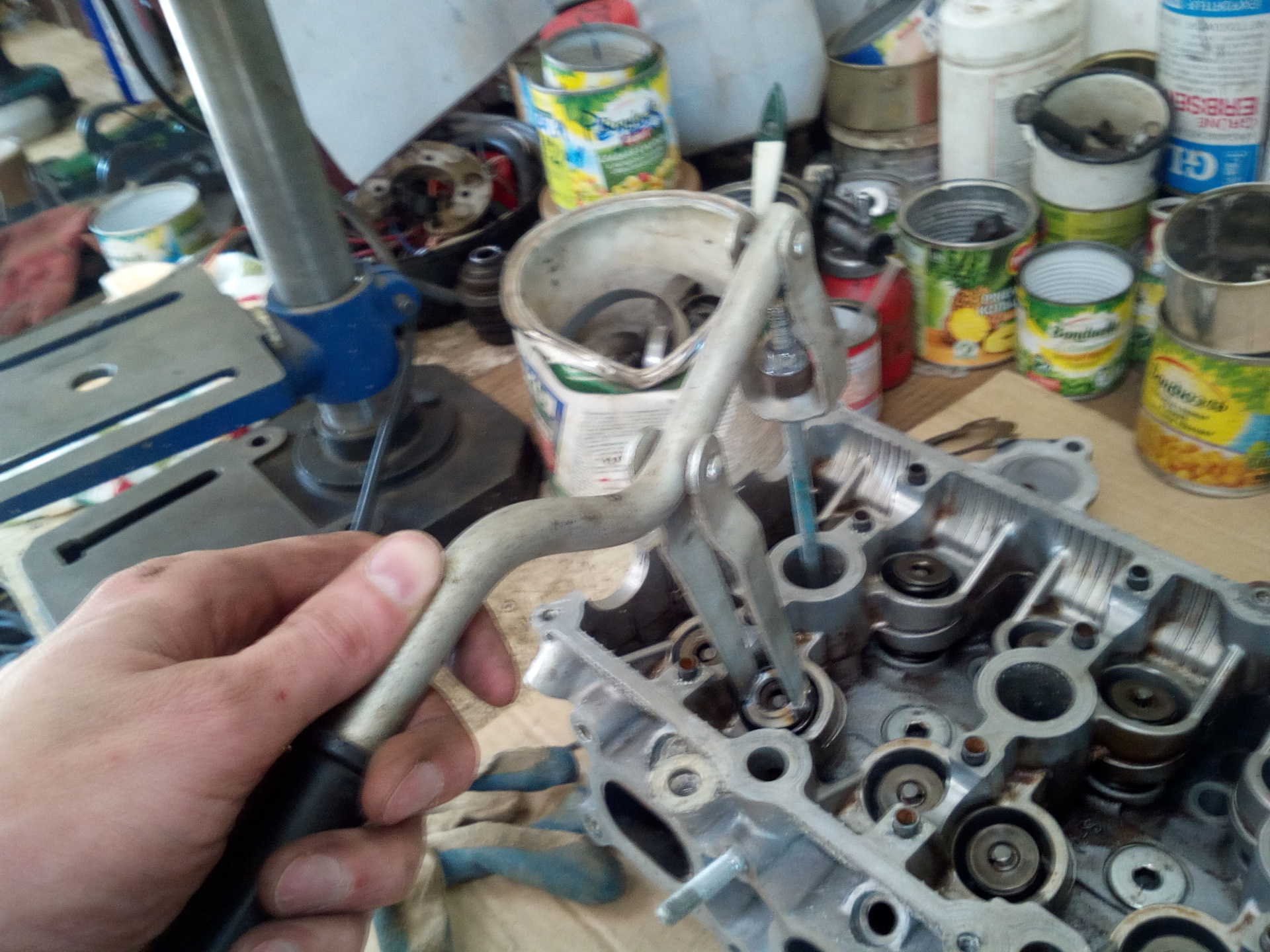 Ремонт ГБЦ. Ну как ремонт, после опрессовки и шлифовки головы в процессе ожидания маслосъемных колпачков я решил притереть клапана, слегка, просто нагар с кромок снять. Рассухариватель собрали из того, что было в гараже. Нашел рассухариватель для "классики", опилил от него тарелку, нашел подходящую по диаметру шайбу, придал ей форму тарелки при помощи шарика от подшипника и пресса, приварили.