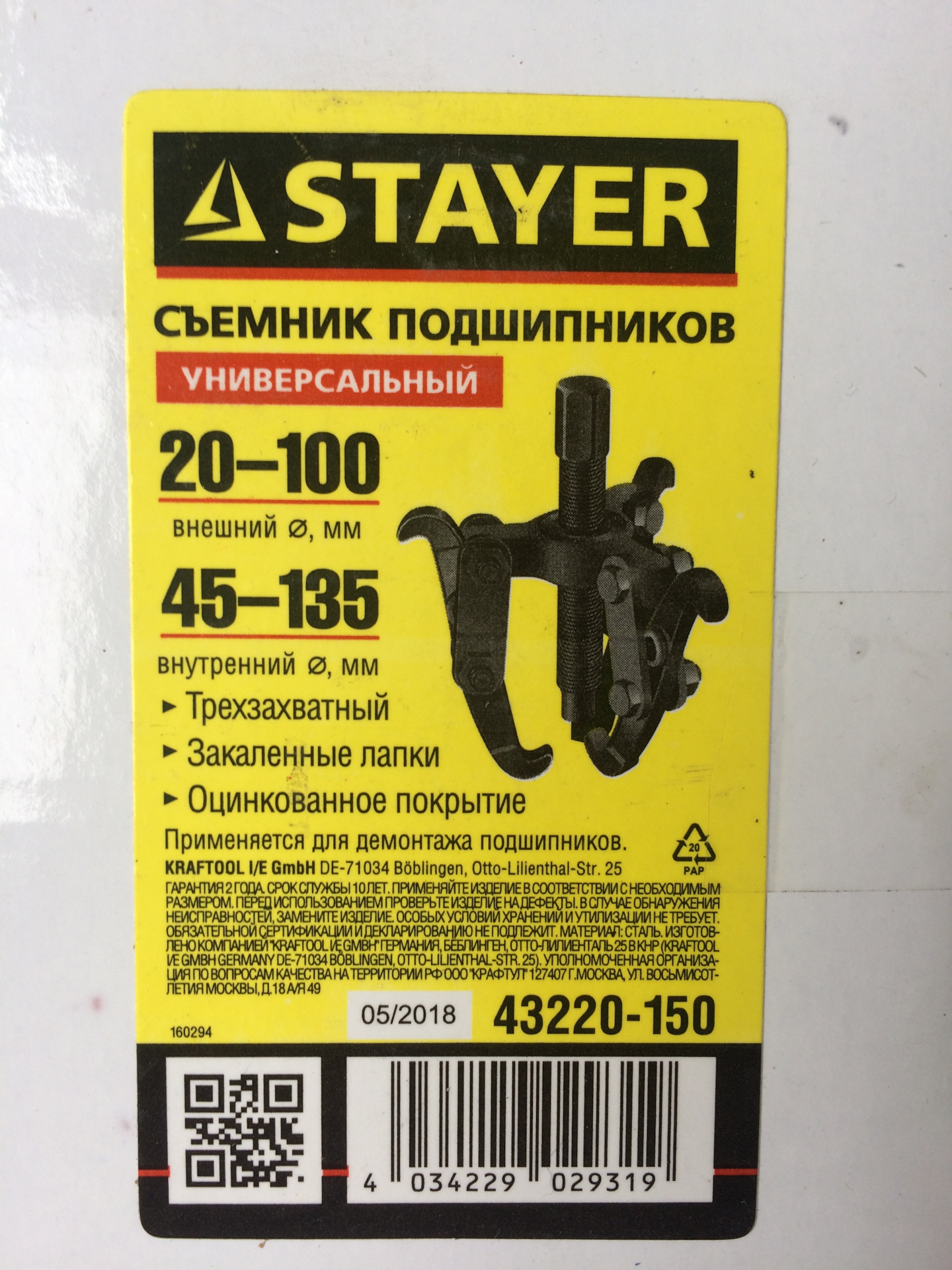 Кованый съемник подшипников, трехзахватный STAYER 43220-150