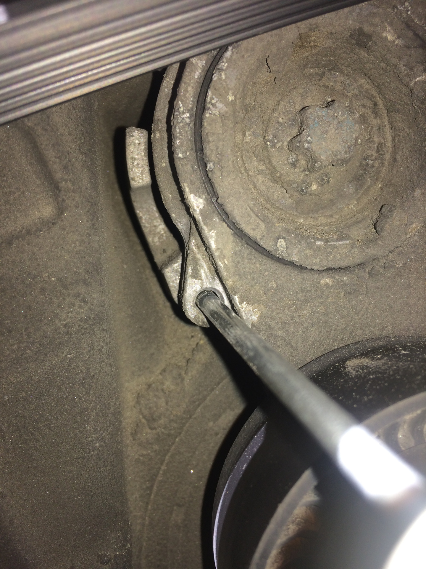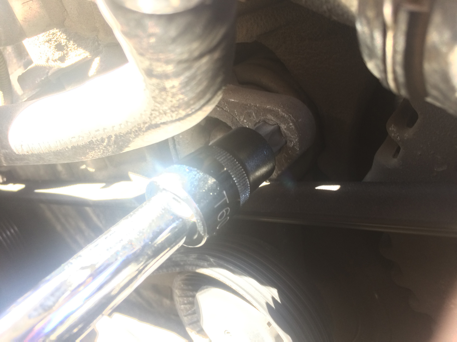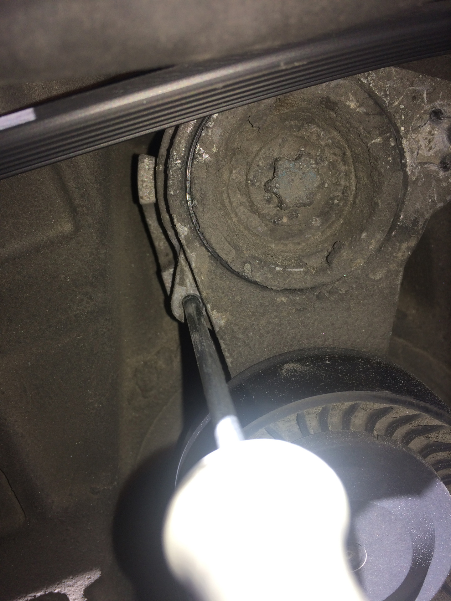 Скидываем приводной ремень с ролика натяжителя. Для этого берем биту Торкс 60, вставляем ее в ролик натяжителя и поворачиваем ПО часовой стрелке.