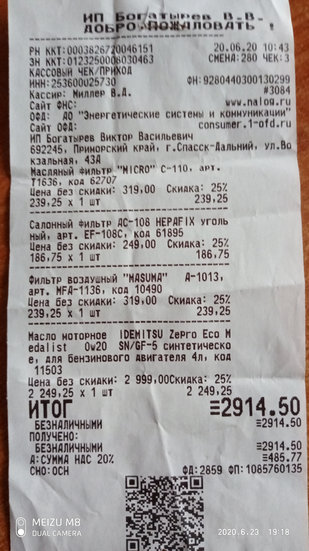 Вот и пролетело время и километры на 7000 км по нашим пыльным и грязным дорогам, решил залить другую марку масла IDEMITSU 0W20 синтетика, отзывов положительных о масле не мало .Зашёл в сеть магазинов "ГиперАвто" где покупаю по карте магазина и увидел скидку 25% на расходники и масла и т.д только три дня, заказал и на следующий день выкупил, если всё взять без скидки 3886р, а со скидкой 2914р всего, скидка составила 971.50., что сколько стоит расписывать не буду скинул фото чека. При замене масла всегда меняю 3 фильтра, масляный, воздушный и салонный, они были пыльные когда постучал об ладонь Цвет масла свежего светло коричневый, не зелёный ., фильтра старые и новые фото!