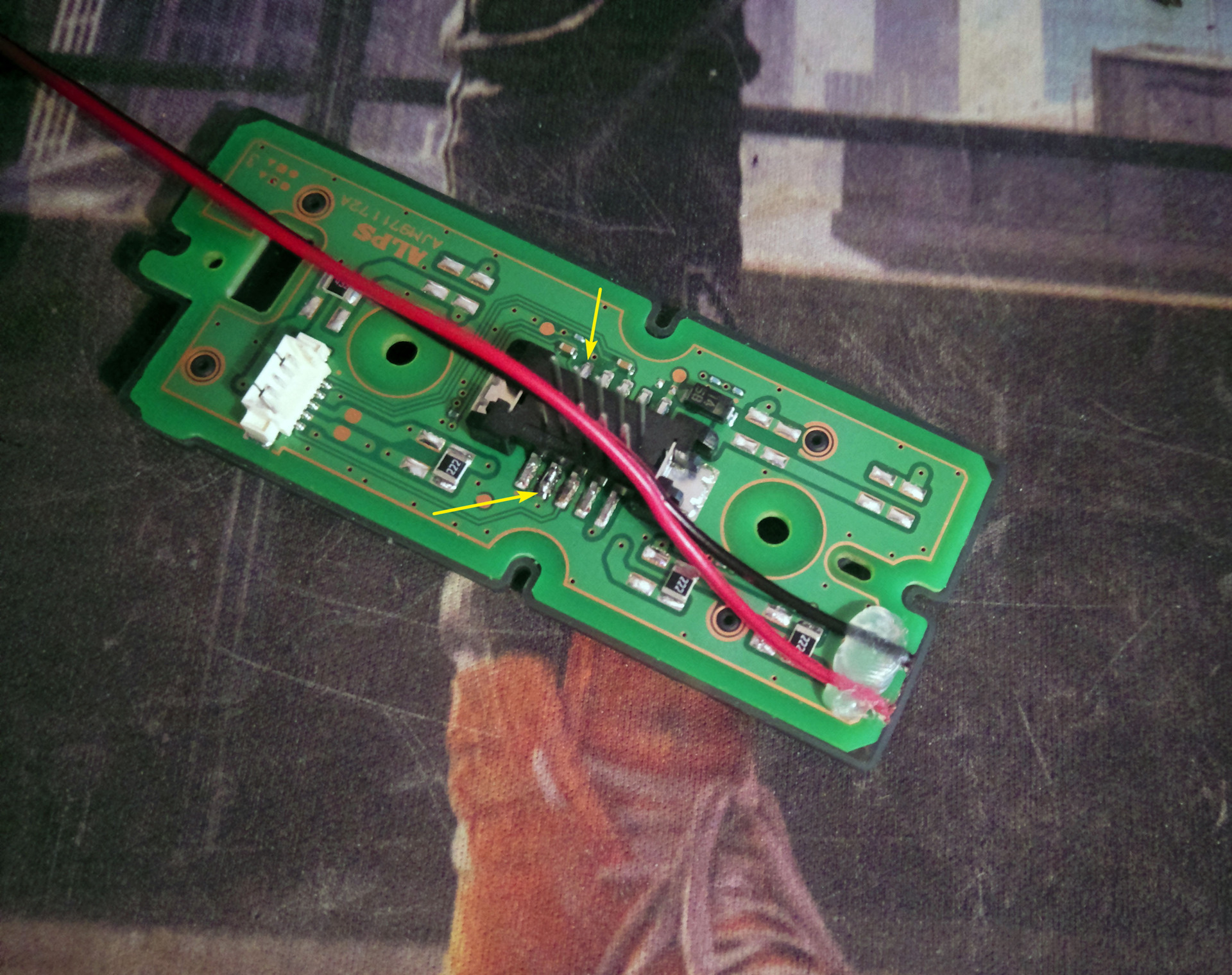 Так вот, припаивать провода я решил по более простому пути — прямо к контактам кнопки. Но для того чтобы провода перенести на другую сторону платы(т.к. поверх кнопок идет силиконовая отформованная защита) пришлось немного ее подточить надфилями и провода колхозно заизолировать от платы расплавленным пластиком.🤦♂️