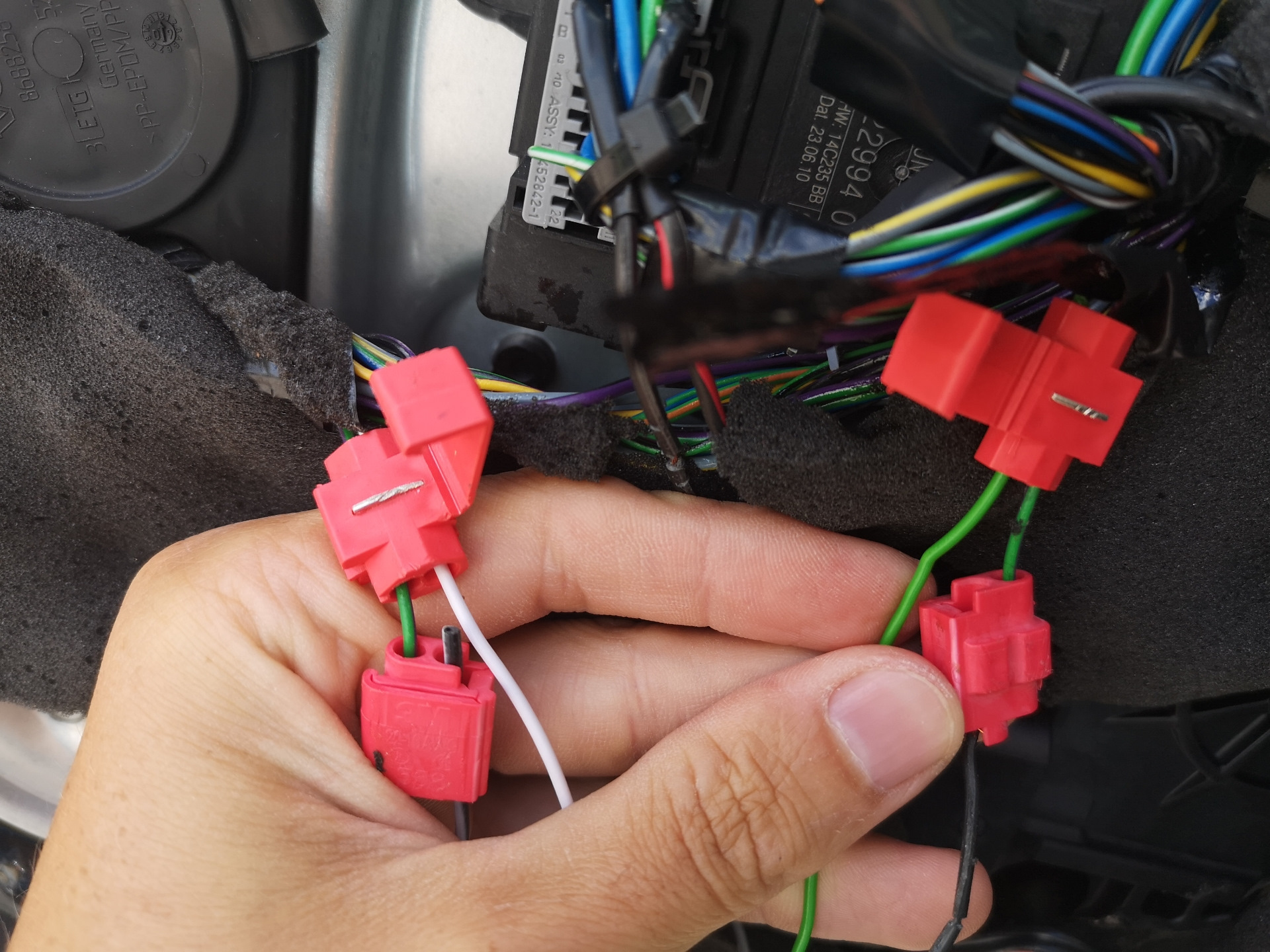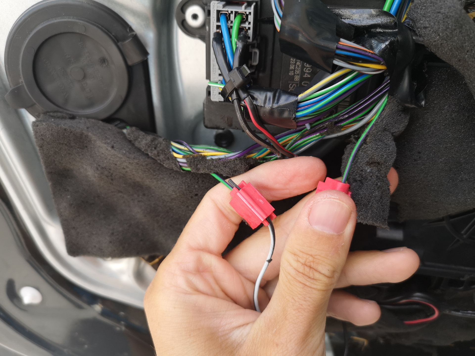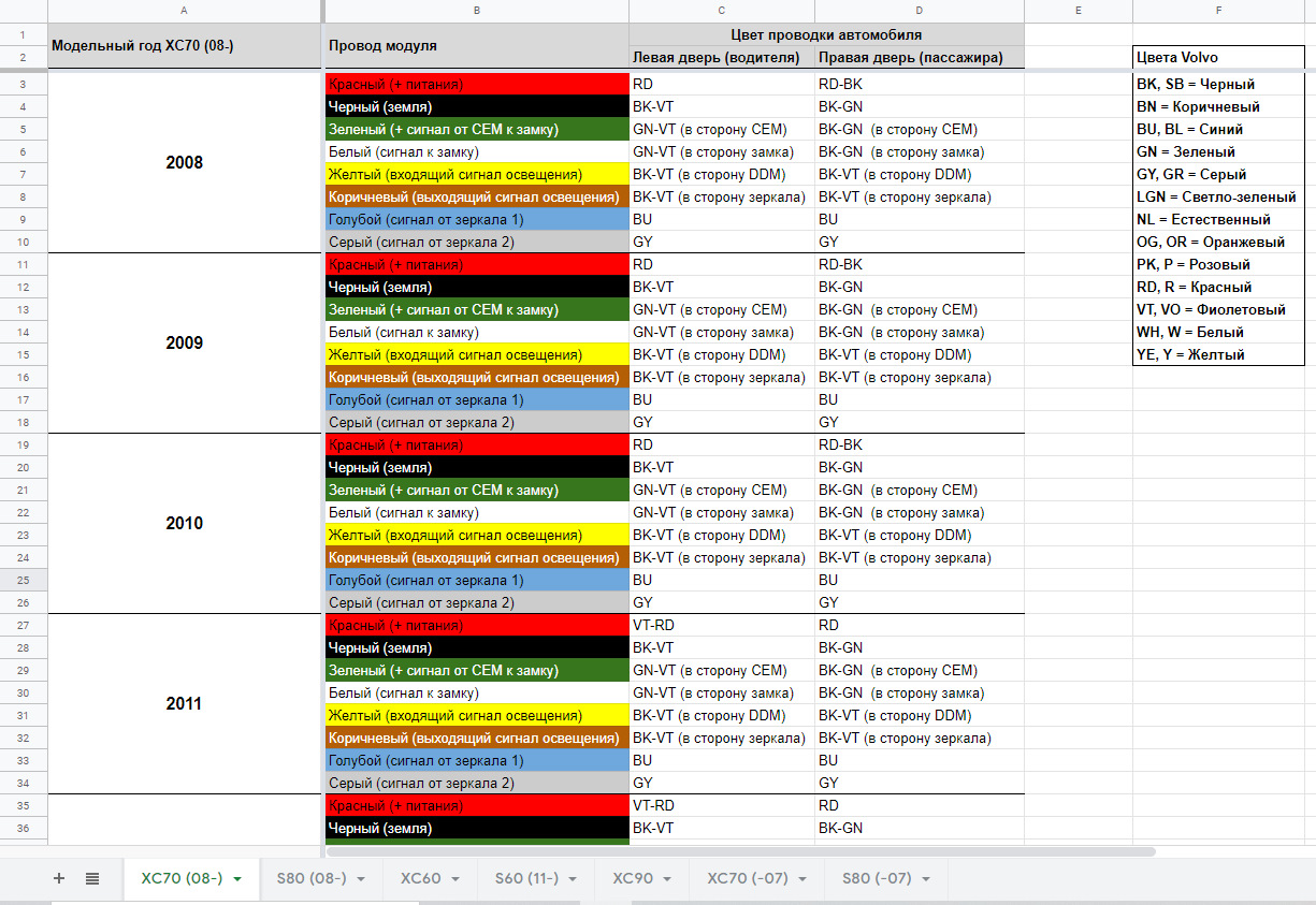 Далее необходимо подключить жгут проводов модуля, в общей сложности 8 проводов. Цвета проводки автомобиля немного отличаются в разных модельных годах для водительской/пассажирской двери. Я подготовил таблицу по цветам проводов на основе EWD схем volvo, подробно можно посмотреть по ссылке: