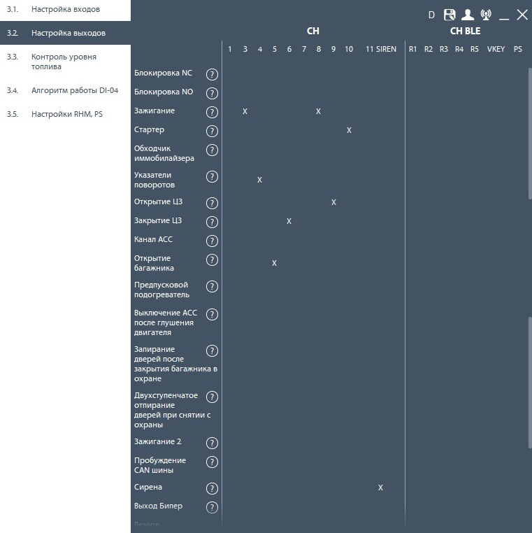 настройка выходов (много крестиков)
