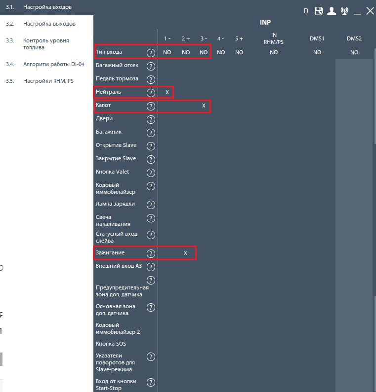 настройка входов ( три крестика! )